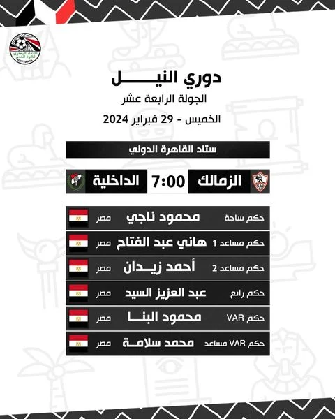 تعرف على طاقم تحكيم مباراة الزمالك والداخلية بالدوري غد الخميس