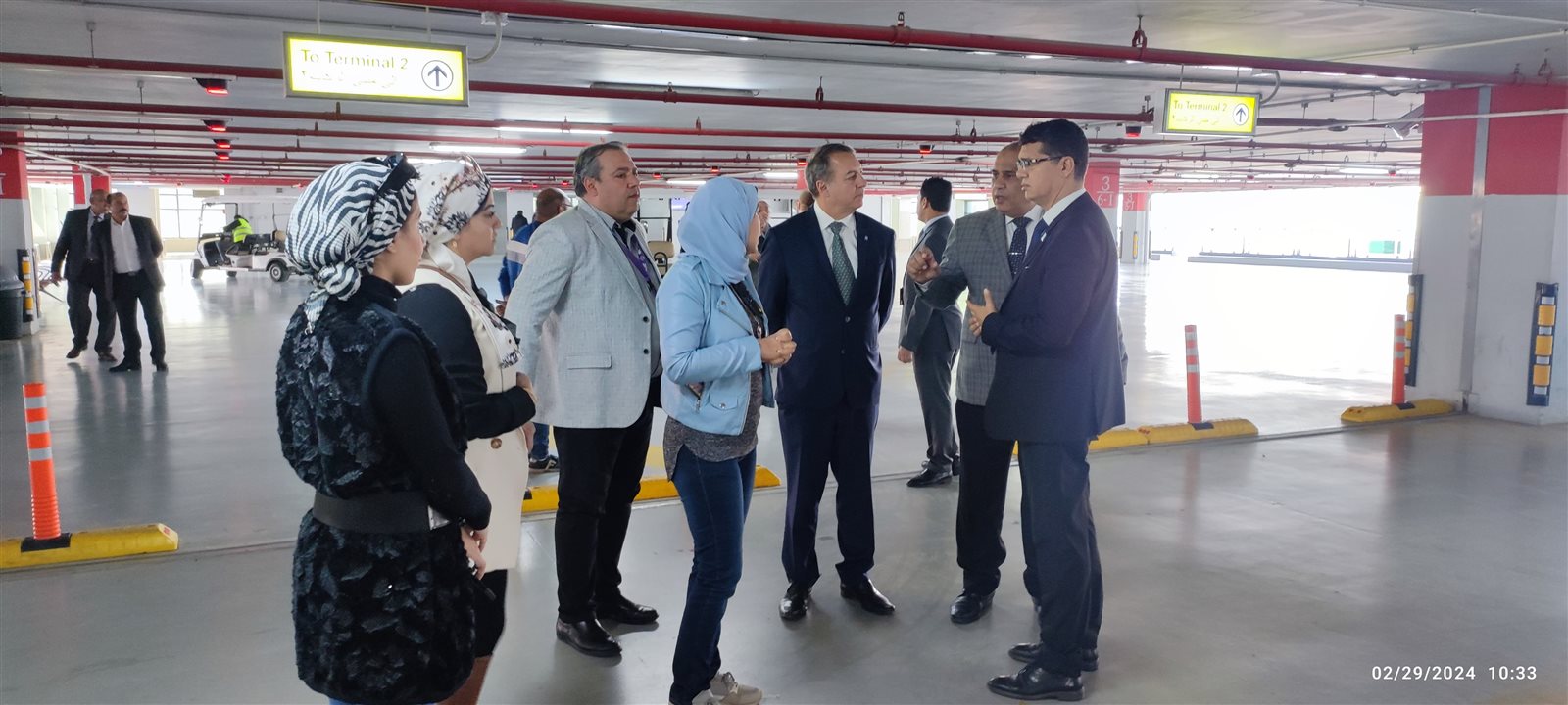 During the visit, the delegation was briefed on the latest developments at Cairo International Airport. They witnessed the electric walkways connecting the multi-storey car park and passenger terminals, equipped with 5 service areas distributed along the walkway, including self-service carts and golf carts. They also visited the multi-storey car park with a capacity of over 2500 cars, covering an area of 18,000 square meters per floor and a total area of 90,000 square meters, in addition to a front parking area serving nearly 100 buses and minibuses. The delegation also visited the new solar power station implemented above the multi-storey car park to support the transition to new and renewable energy in the aviation sector. Also the airport lounges were equipped with units for charging mobile phones and laptops powered by the solar station.