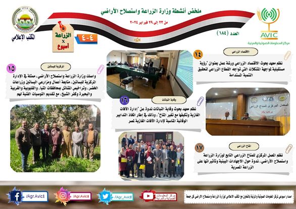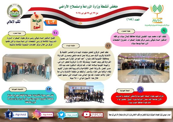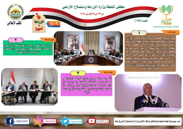 أصدر مركز المعلومات الصوتية والمرئية، التابع لوزارة الزراعة واستصلاح الاراضي، "الانفوجراف الاسبوعي" في نسخته رقم ١٨٤ ، حول الحصاد الاسبوعي لأهم أنشطة الوزارة، خلال الاسبوع الماضي في الفترة من ٢٣ وحتى ٢٩ فبراير الجاري، وذلك بالتعاون مع المكتب الاعلامي للوزارة، كما أصدر المركز ايضا ملخصا بالفيديو، حول انشطة الوزارة خلال نفس الفترة.