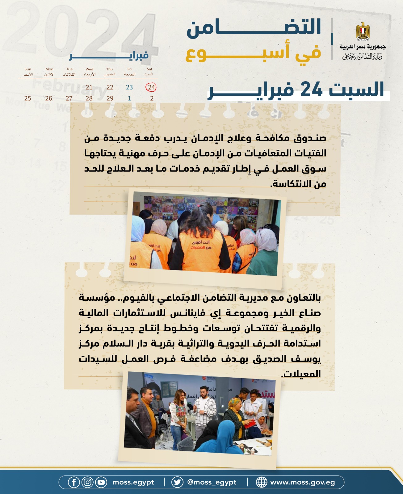 -  صندوق مكافحة وعلاج الإدمان يدرب دفعة جديدة من الفتيات المتعافيات من الإدمان على حرف مهنية يحتاجها سوق العمل في إطار تقديم خدمات ما بعد العلاج للحد من الانتكاسة.