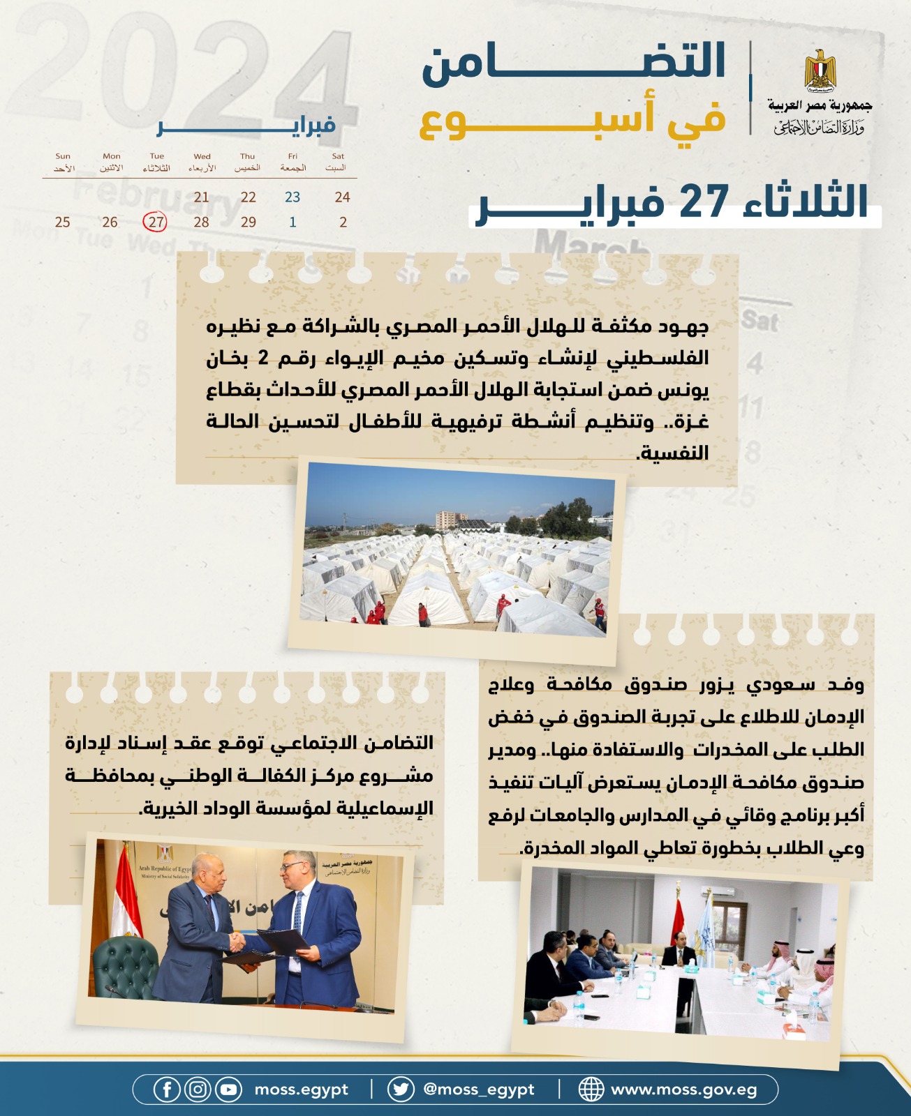 - جهود مكثفة للهلال الأحمر المصري بالشراكة مع نظيره  الفلسطيني لإنشاء وتسكين مخيم الإيواء رقم 2 بخان يونس ضمن استجابة الهلال الأحمر المصري للأحداث بقطاع  غزة.. وتنظيم أنشطة ترفيهية للأطفال لتحسين الحالة النفسية.