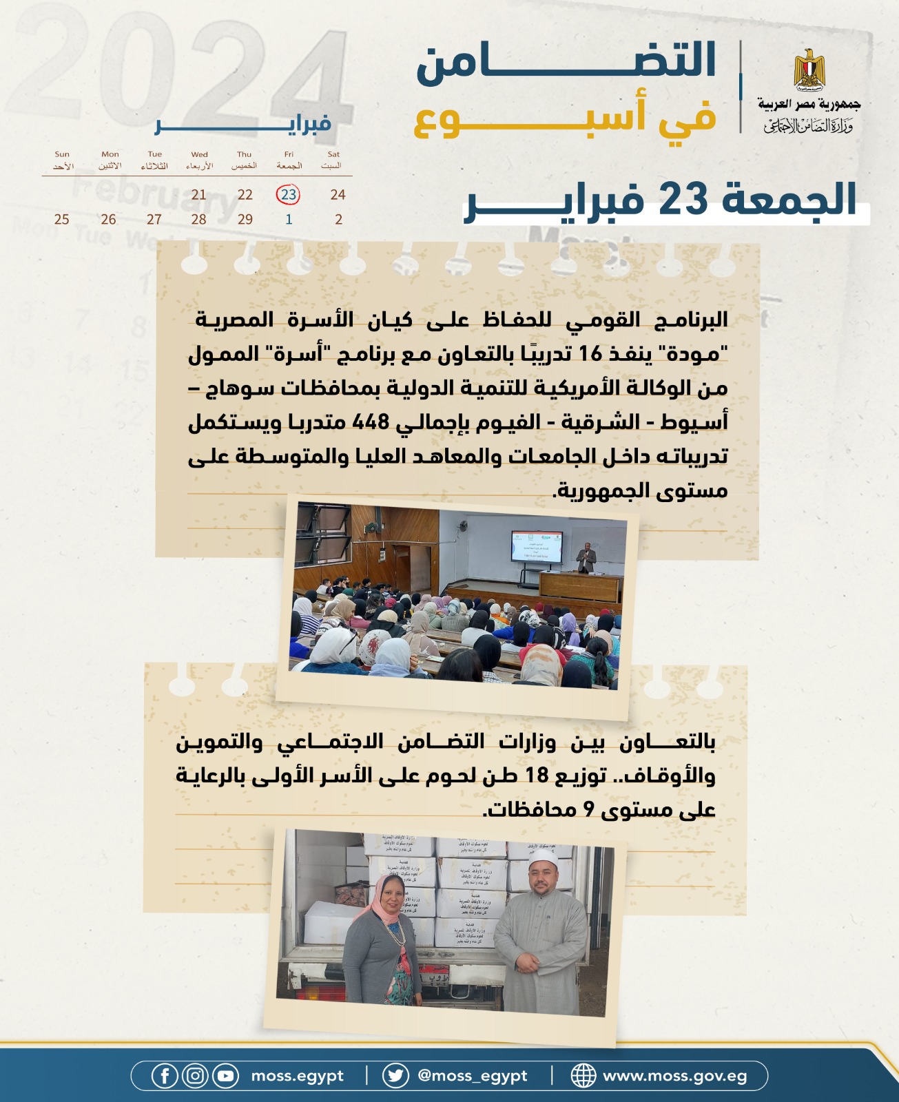 - البرنامج القومي للحفاظ على كيان الأسرة المصرية "مودة" ينفذ ١٦ تدريبًا بالتعاون مع برنامج "أسرة" الممول من الوكالة الأمريكية للتنمية الدولية بمحافظات سوهاج – أسيوط - الشرقية - الفيوم بإجمالي ٤٤٨ متدربا ويستكمل تدريباته داخل الجامعات والمعاهد العليا والمتوسطة على مستوى الجمهورية.