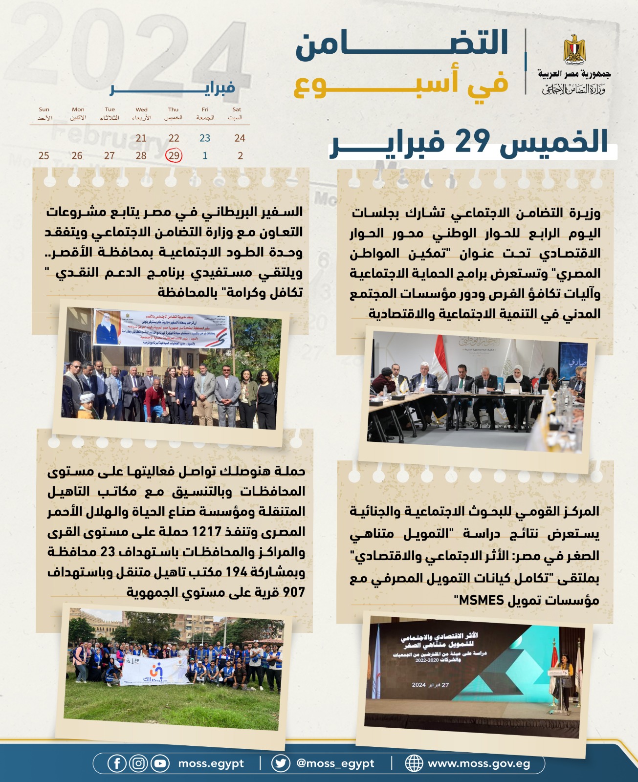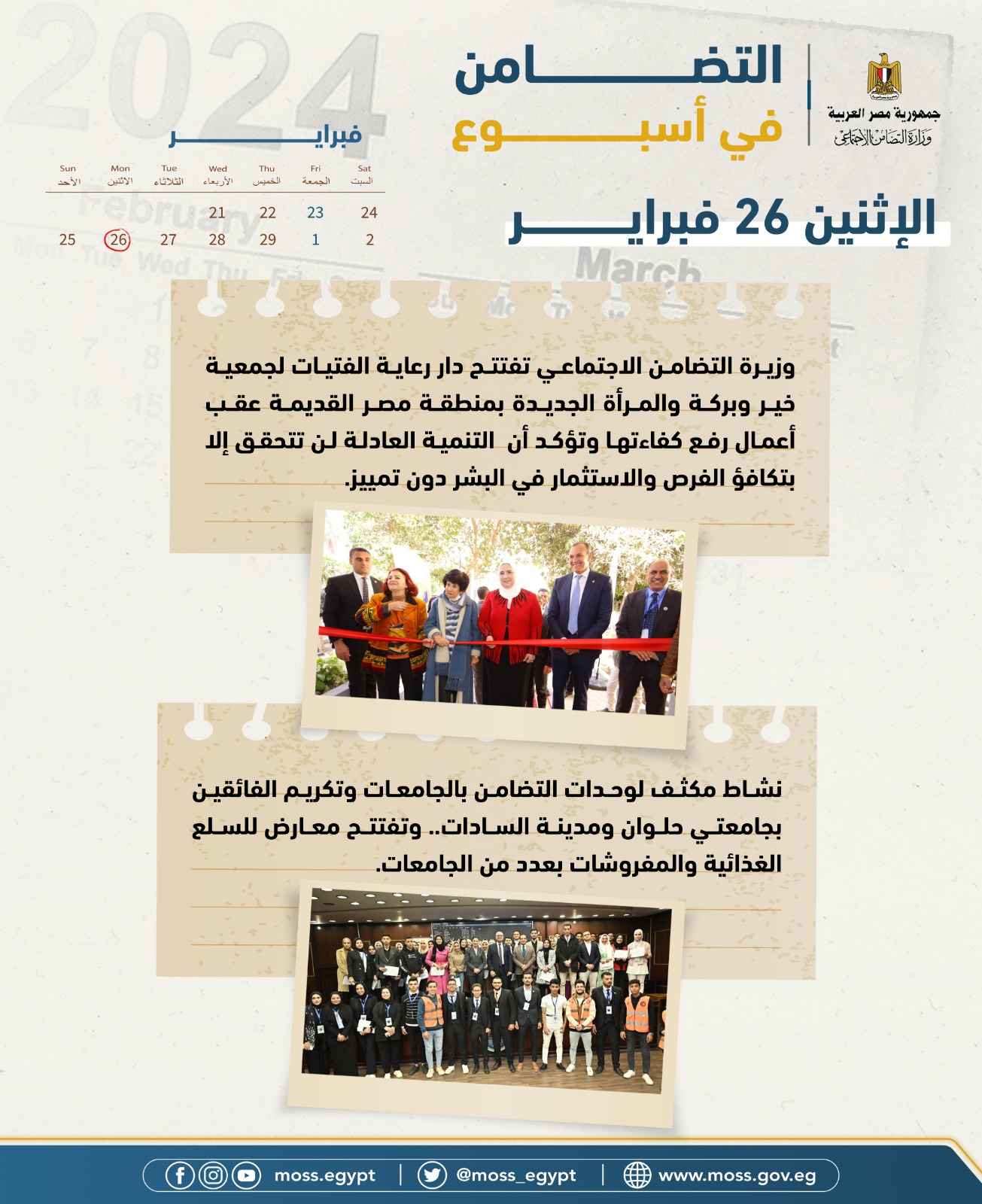 أصدرت وزارة التضامن الاجتماعي تقريرها الأسبوعي بالإنفوجراف والفيديو، حيث تستعرض من خلاله الأنشطة والأحداث، التي قامت بها السيدة نيفين القباج وزيرة التضامن الاجتماعي، وكذلك قطاعات الوزارة المختلفة خلال الفترة من  23 فبراير  إلى 29 فبراير 2024 ونستعرض أبرزها في التقرير التالي: