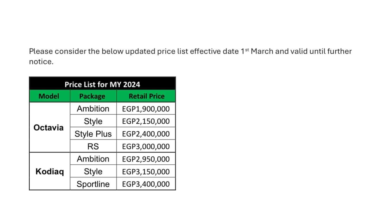 وتعد القائمة الجديدة التي يتم العمل بها بداية من شهر مارس هي أول قائمة سعرية لسيارات سكودا منذ أبريل 2023.