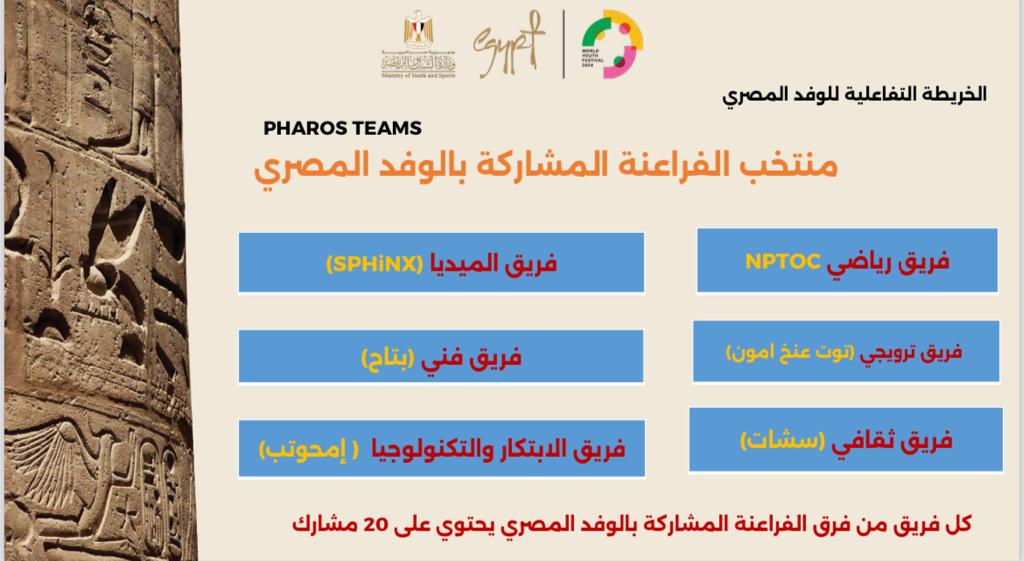 وتم عمل خريطة تفاعلية للوفد المصري الي 6 فرق للمنتخب الفراعنة المشاركه بالمهرجان