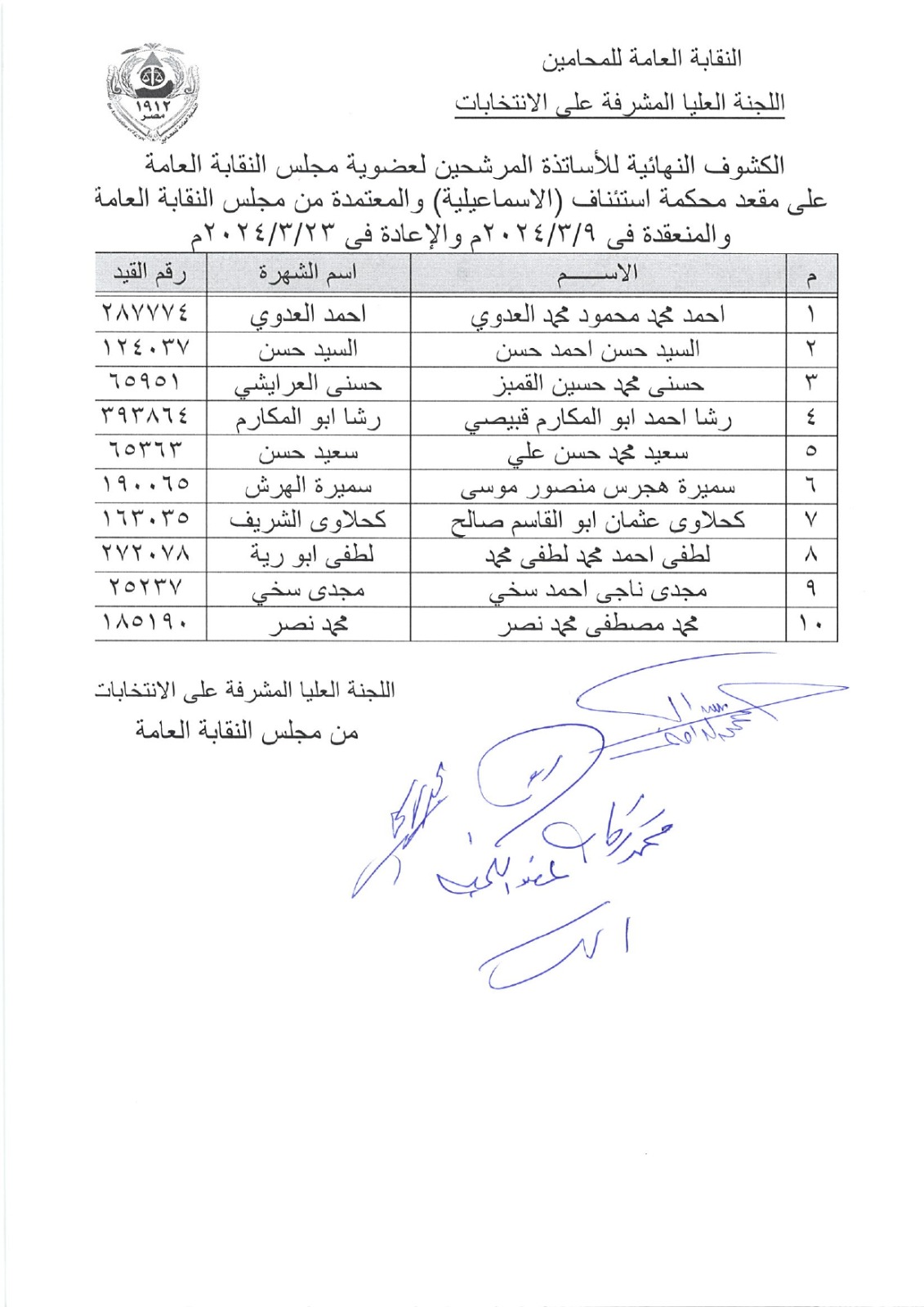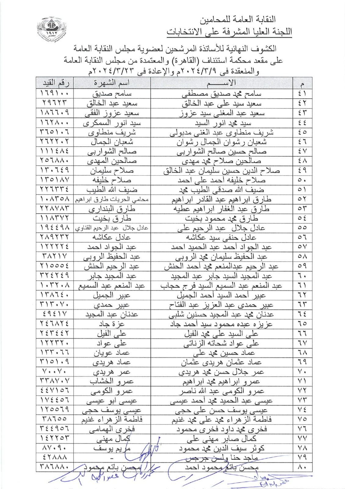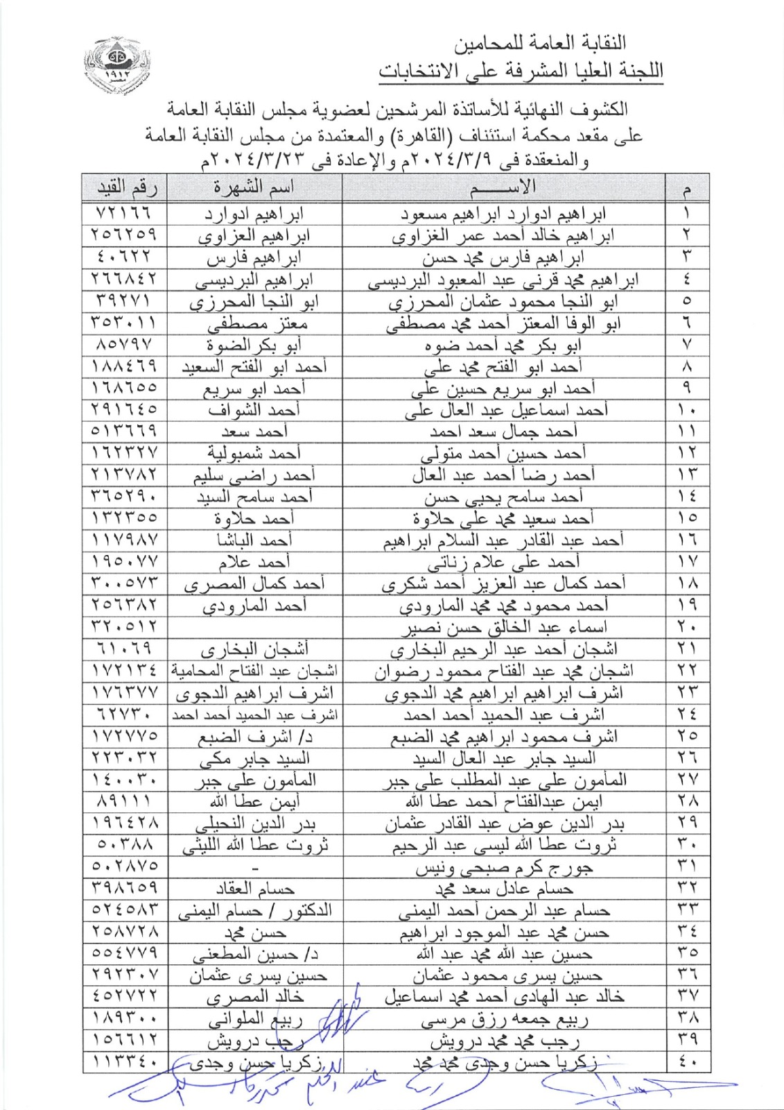 الكشوف النهائية المعتمدة من مجلس نقابة المحامين للمرشحين على مقعد المجلس والنقيب