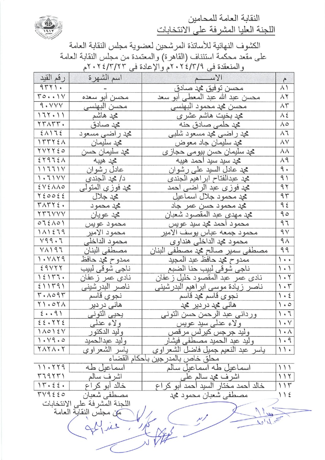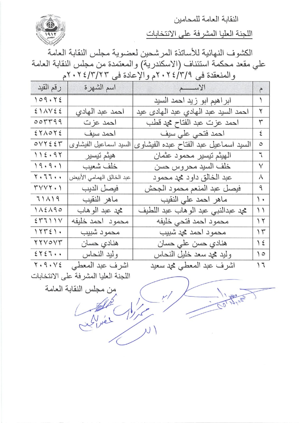 وجاءت الكشوف النهائية المعتمدة من مجلس النقابة العامة كالآتي: