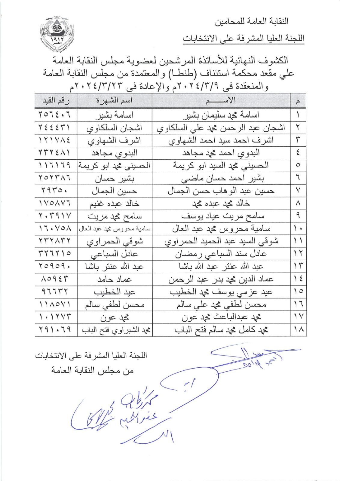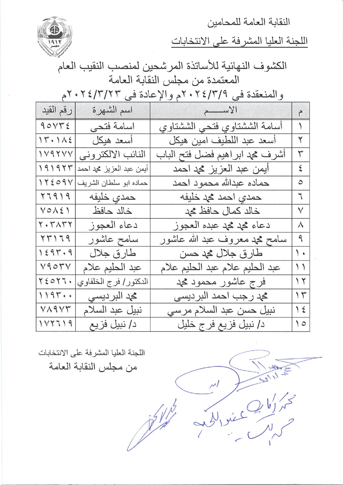 أعلنت اللجنة العليا المشرفة على انتخابات نقابة المحامين، عن الكشوف النهائية للمرشحين على منصب النقيب العام، والمرشحين على عضوية المجلس، والمعتمدة من مجلس النقابة العامة.