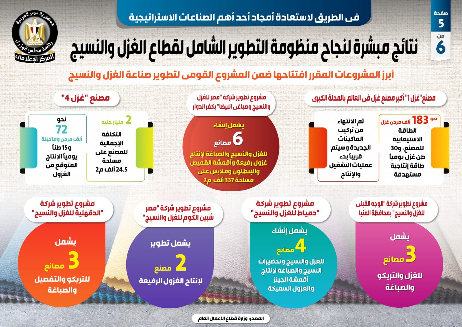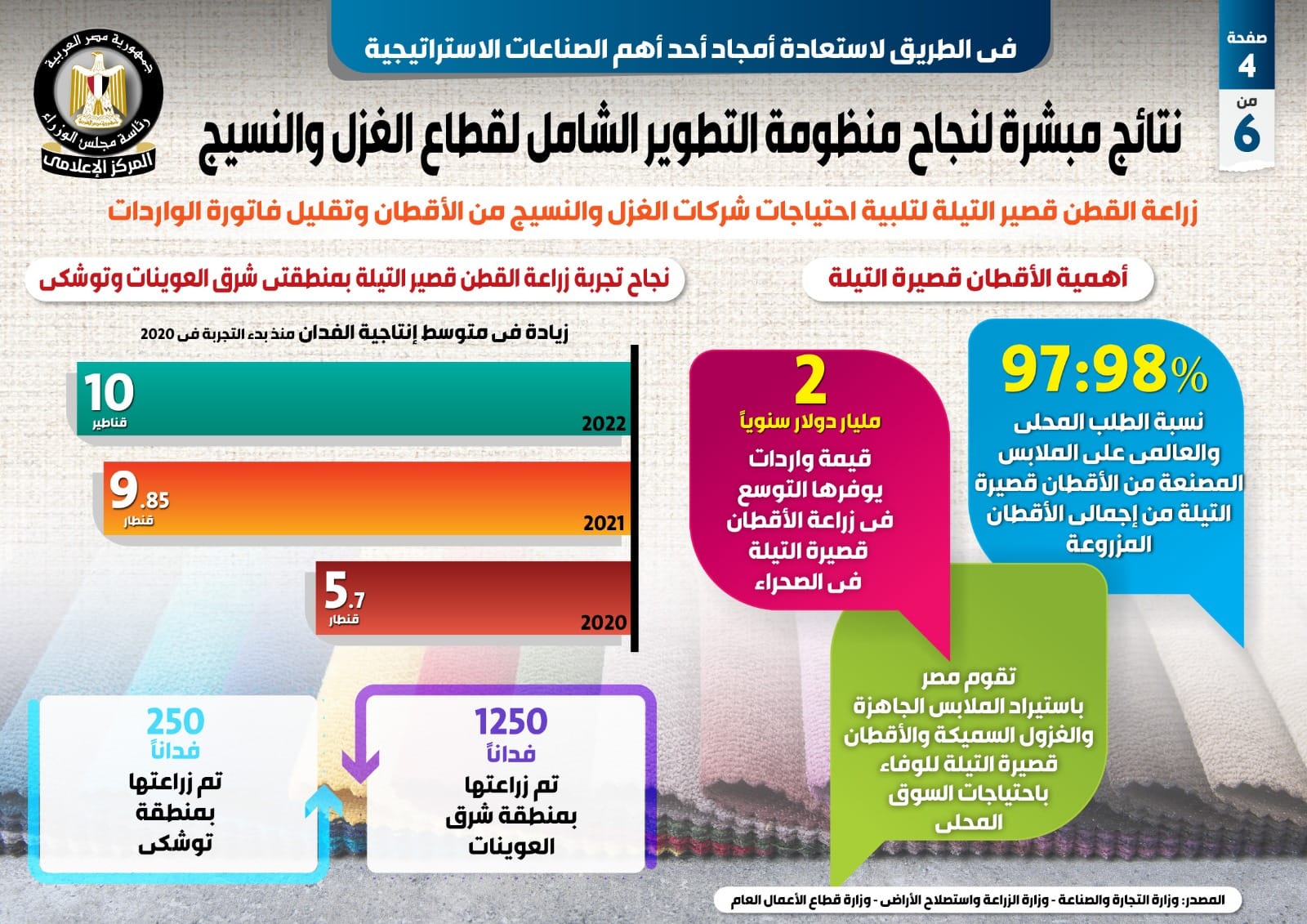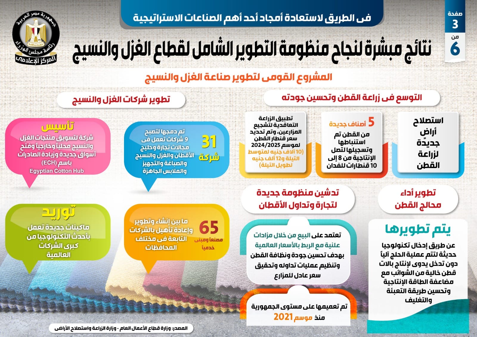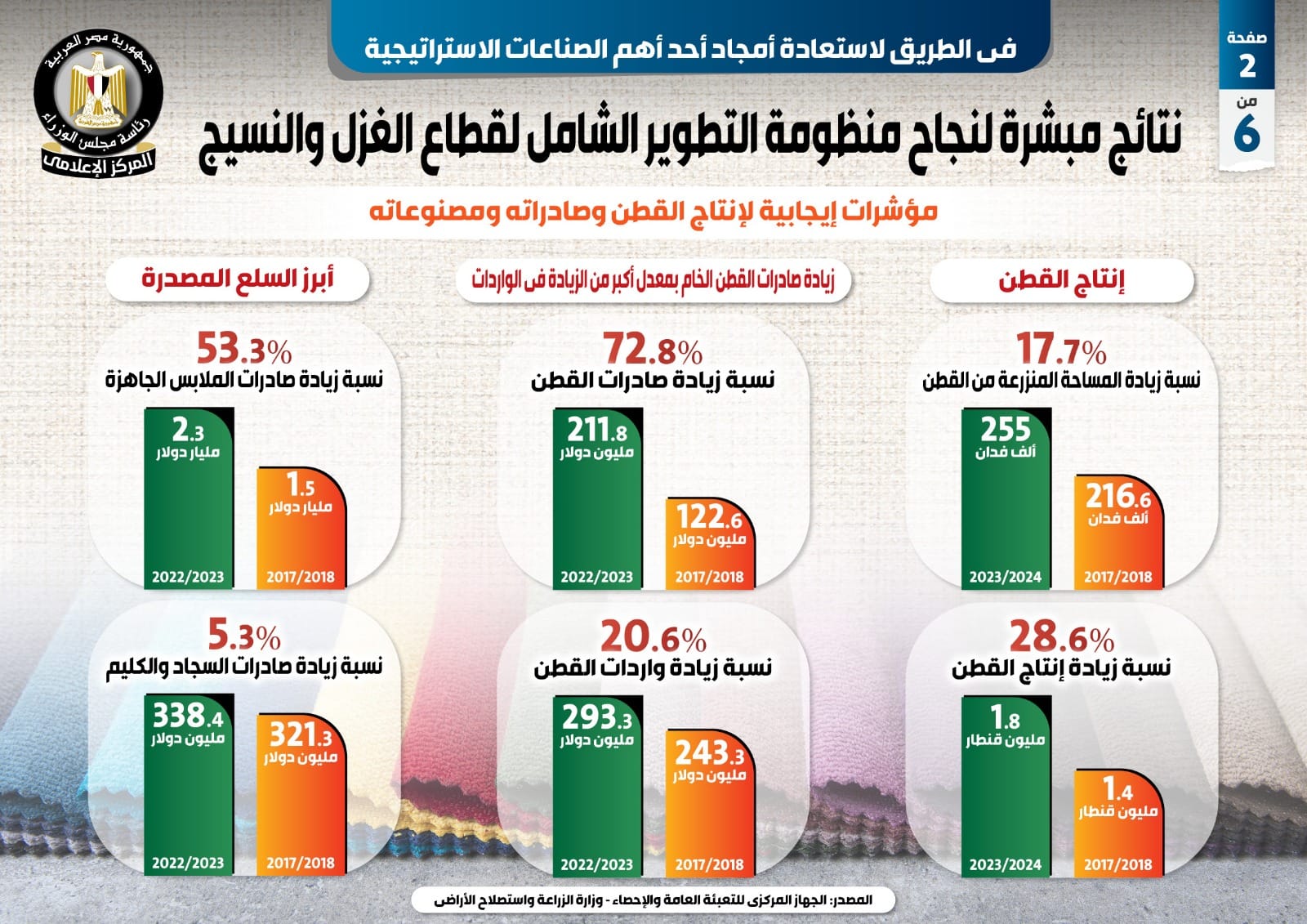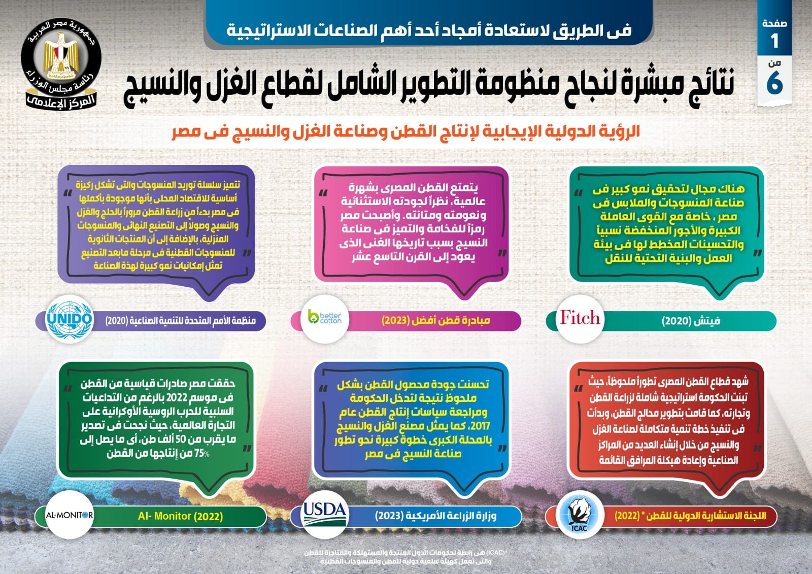 وفي هذا الصدد نشر المركز الإعلامي لمجلس الوزراء تقريراً تضمن إنفوجرافات تسلط الضوء على النتائج المبشرة لنجاح منظومة التطوير الشامل لقطاع الغزل والنسيج، وذلك في الطريق لاستعادة أمجاد أحد أهم الصناعات الاستراتيجية.
