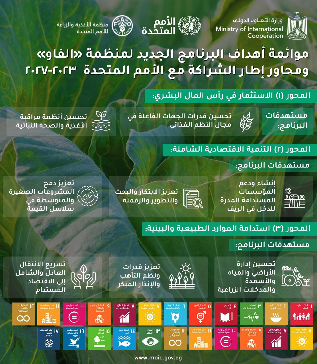 وتتكامل أهداف البرنامج الجديد مع إطار الشراكة مع الأمم المتحدة؛ وفي إطار المحور الأول من محاور التعاون مع الأمم المتحدة: الاستثمار في رأس المال البشري، فإن البرنامج القطري لمنظمة «الفاو» يستهدف دعم الحكومة والمنظمات غير الحكومية والقطاع الخاص والأطراف الفاعلة، من أجل ضمان وضع سياسات وإعداد استراتيجيات لمتابعة الجهود الوطنية لتحويل النظم الغذائية في مصر، وكذلك تحسين موائمة أنظمة الرقابة على الأغذية والصحة النباتية في مصر مع المعايير الدولية.
