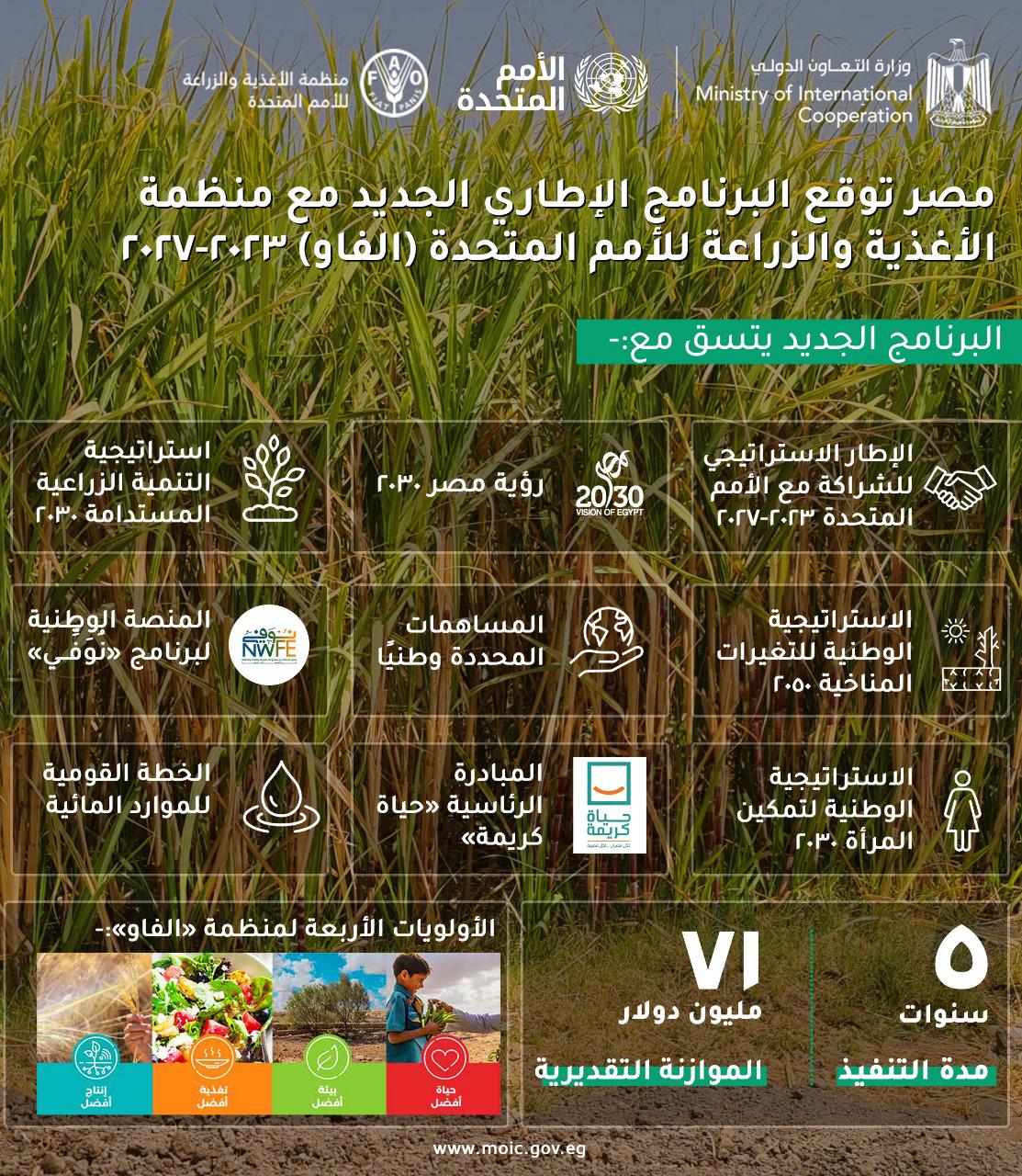 وأطلقت وزارة التعاون الدولي بالشراكة مع المنسق المقيم للأمم المتحدة في مصر، خلال مايو الماضي وبتشريف السيد الدكتور رئيس مجلس الوزراء، الإطار الاستراتيجي للشراكة بين مصر والأمم المتحدة للفترة ٢٠٢٣-٢٠٢٧، الذي ينظم انشطة ومشروعات الامم المتحدة ووكالاتها المتخصصة في مصر، الذي قادت تصميمه وإعداده وزارة التعاون الدولي والأمم المتحدة بناءً على التحليل القطري المشترك للأمم المتحدة وتوصيات والدروس المستفادة من إطار العمل السابق المنتهي في 2022، كما أن برنامج «الفاو» في مصر، يتماشى مع رؤية مصر التنموية 2030، والمبادرات والاستراتيجيات القطاعية وخطط العمل الوطنية، وخطة عمل التنمية الزراعية المستدامة 2030، والاستراتيجية الوطنية للتغيرات المناخية 2050، والمساهمات المحددة وطنيًا NDCs، وكذلك المنصة الوطنية لبرنامج «نُوَفِّي» محور الارتباط بين مشروعات المياه والغذاء والطاقة، واستراتيجية تمكين المرأة 2030، ومبادرة «حياة كريمة»، وغيرها من الاستراتيجيات والخطط ذات الصلة.