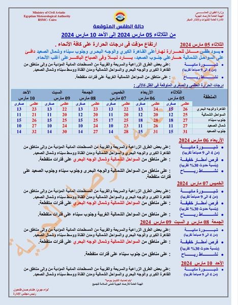 وأوضحت هيئة الأرصاد أنَّه يسود اليوم الثلاثاء، أجواء دافئة إلى مائلة للحرارة نسبيًا، فضلًا عن ارتفاع تدريجى غربا، ليكون الطقس لطيف على السواحل الشمالية الغربية، مائل للبرودة على السواحل الشمالية الشرقية معتدل على السلوم مائل للبرودة على كاترين.