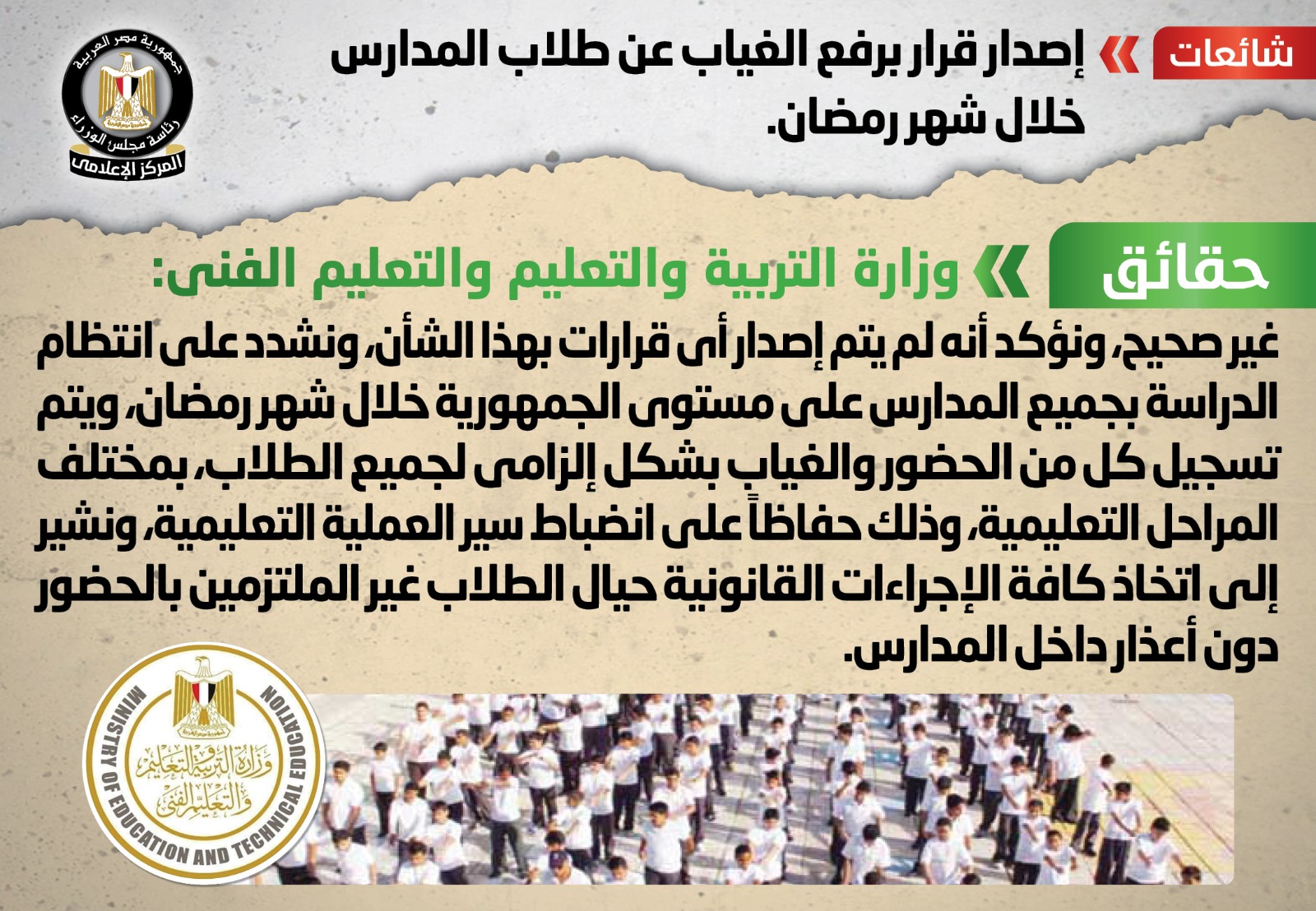انتشر في بعض المواقع الإلكترونية وصفحات التواصل الاجتماعي أنباء بشأن إصدار قرار برفع الغياب عن طلاب المدارس خلال شهر رمضان، وقد قام المركز الإعلامي لمجلس الوزراء بالتواصل مع وزارة التربية والتعليم والتعليم الفني، والتي نفت تلك الأنباء، مُؤكدةً أنه لا صحة لرفع الغياب عن طلاب المدارس خلال شهر رمضان، وأنه لم يتم إصدار أي قرارات بهذا الشأن، مُشددةً على انتظام الدراسة بجميع المدارس على مستوى الجمهورية خلال شهر رمضان، ويتم تسجيل كل من الحضور والغياب بشكل إلزامي لجميع الطلاب، بمختلف المراحل التعليمية، وذلك حفاظا على انضباط سير العملية التعليمية، مُشيرةً إلى اتخاذ كافة الإجراءات القانونية حيال الطلاب غير الملتزمين بالحضور دون أعذار داخل المدارس.