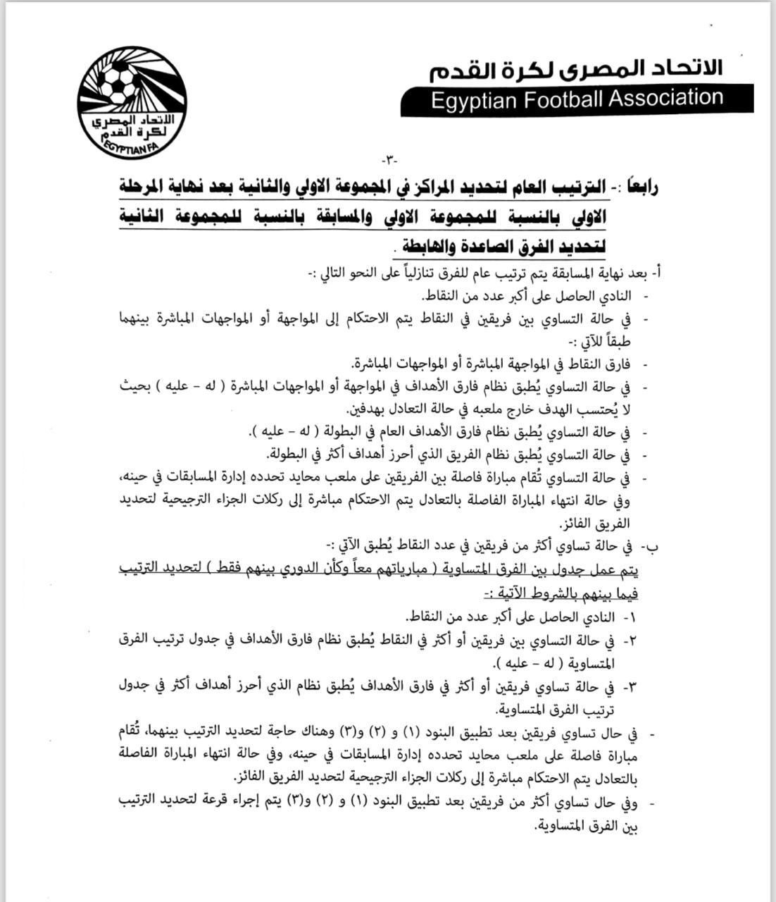 أرسل نادي وادي دجلة الذي يلعب بدوري المحترفين، خطابا رسميا إلى الاتحاد المصري لكرة القدم، يستفسر خلاله عن آلية حسم الصاعدين للدوري الممتاز وكذلك الهابطين للدرجة الأدنى، وذلك في حالة تساوي فريقين أو أكثر في عدد النقاط.