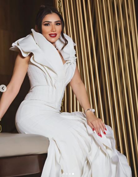 وتألقت مي عمر بإطلالة ساحرة، مواكبة لأحدث صيحات الموضة لهذا العام، حيث ارتدت فستان طويل مجسم، اتسم بقصة الداربية من الأمام، محدد الخصر، صمم من قماش فاخر بلون الأوف وايت، مما عكس قوامها الممشوق ووزنها المثالي، الفستان مزج بين الأحتشام والفخامة في آن واحد مما جعله مثال تقتدي به الفتيات والسيدات في مقابلتهن الخاصة.