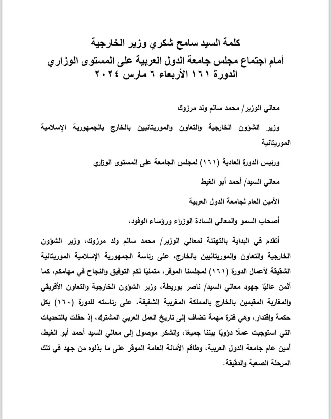 ألقي سامح شكري، وزير الخارجية، كلمة اليوم، أمام اجتماع مجلس جامعة الدول العربية على المستوى الوزاري الدورة 161.