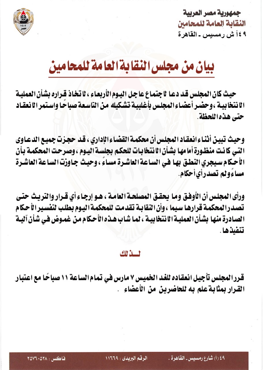 بيان من مجلس النقابة العامة للمحامين