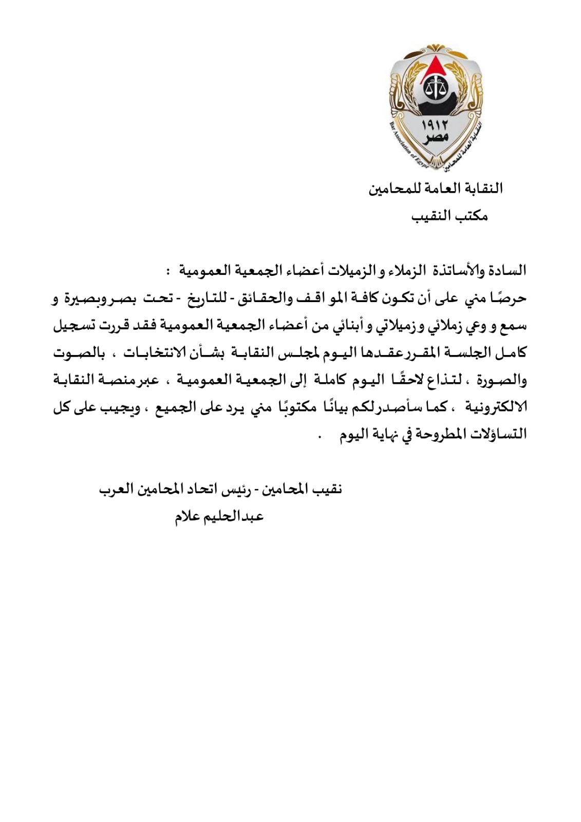 حرصًا مني على أن تكون كافة المواقف والحقائق ـ للتاريخ ـ تحت بصر وبصيرة وسمع ووعي زملائي وزميلاتي وأبنائي من أعضاء الجمعية العمومية، فقد قررت تسجيل الجلسة المقرر عقدها اليوم لمجلس النقابة بشأن الانتخابات، ويكون التسجيل بالصوت والصورة، لتذاع الجلسة كاملة اليوم إلى أعضاء الجمعية العمومية، وذلك عبر منصة النقابة الإلكترونية.