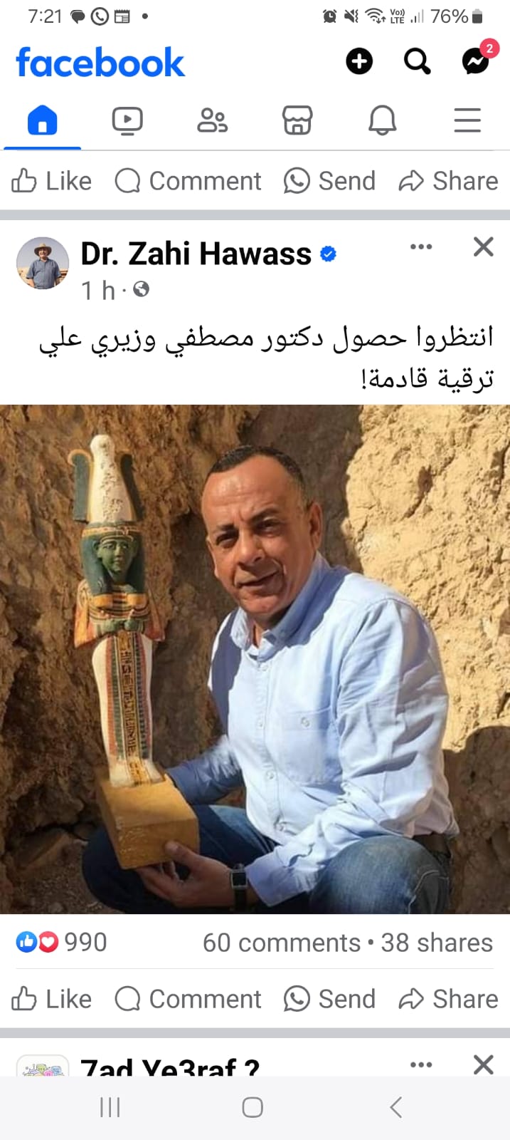 اثار بوست علي الصفحة  الرسمية لعالم الآثار دكتور زاهي حواس  وزير الآثار الأسبق  يقول عنوانه  انتظروا ترقية الدكتور مصطفى وزيري رئيس المجلس الأعلى للاثار لمنصب جديد.