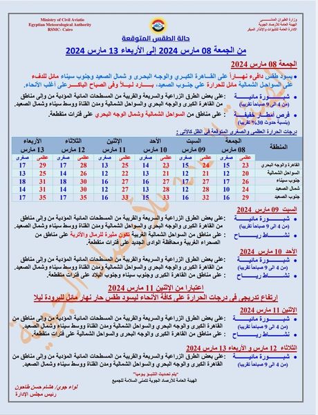 القاهرة والوجه البحري: العظمى 23 والصغرى 15 درجة مئوية.