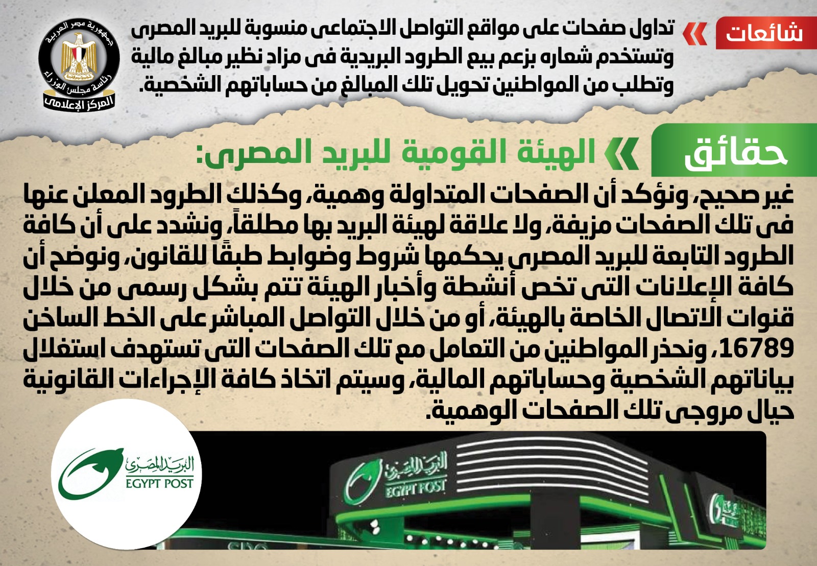 أكد المركز الإعلامي لمجلس الوزراء، والهيئة القومية للبريد المصري، أنه لا صحة لبيع الطرود البريدية في مزاد نظير مبالغ مالية، أو طلب أي تحويلات مالية من المواطنين من حساباتهم الشخصية، وقال بين مشترك بين الجهتين أن الصفحات المتداولة وهمية، وكذلك الطرود المعلن عنها في تلك الصفحات مزيفة، ولا علاقة لهيئة البريد بها مطلقًا، وشدد على أن الطرود كافة التابعة للبريد المصري يحكمها شروط وضوابط طبقًا للقانون.