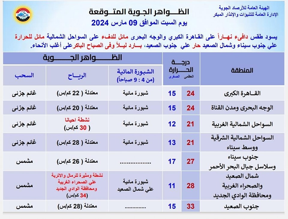 كشفت الهيئة العامة للأرصاد الجوية، أن طقس غدا السبت، دافئ نهارا على القاهرة الكبرى والوجه البحري، ومائل للدفء على السواحل الشمالية، ومائل للحرارة على جنوب سيناء وشمال الصعيد، وحار على جنوب الصعيد، وبارد ليلا وفي الصباح الباكر على أغلب الأنحاء.