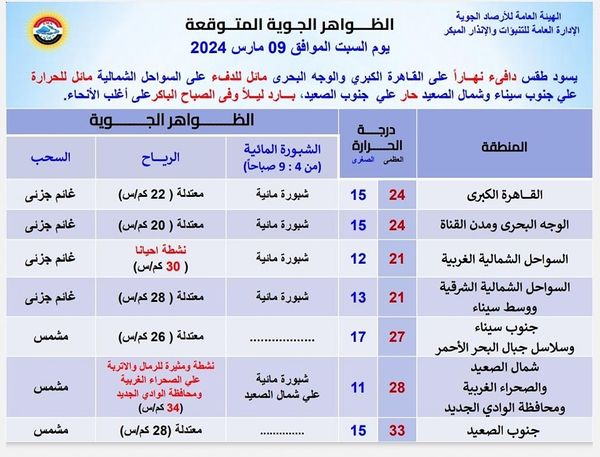 ومن المتوقع أن يسود اليوم طقس دافئ نهارا على القاهرة الكبرى والوجه البحري، مائل للدفء على السواحل الشمالية، بينما يكون مائلا للحرارة على جنوب سيناء وشمال الصعيد، وحار على جنوب الصعيد، ويكون باردا ليلا وفي الصباح الباكر على أغلب الأنحاء.