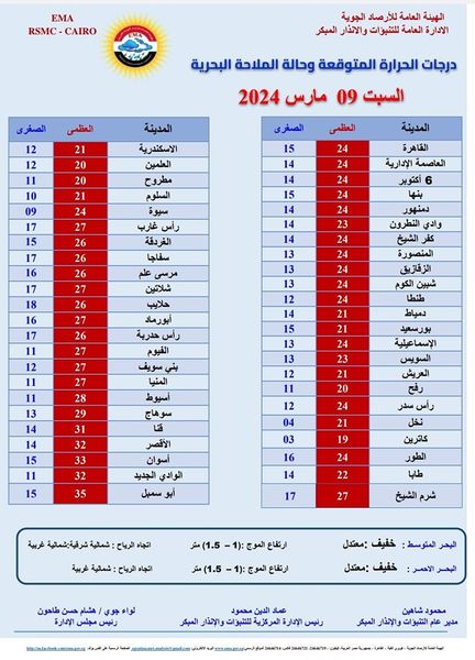 الوجه البحري العظمى 21 درجة والصغرى 12 درجة.