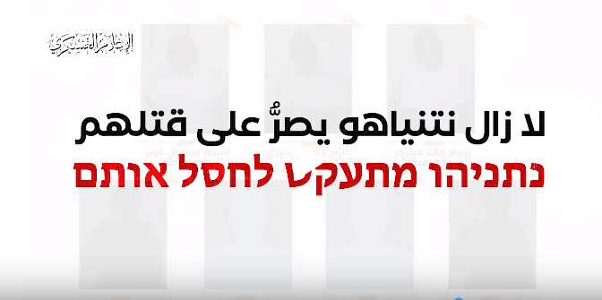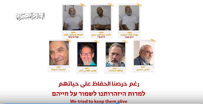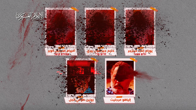 نشرت كتائب القسام مقطع فيديو جديدًا عن الأسرى الثلاثة المسنين وأربعة آخرين، وأعلنت مقتلهم، وقالت: "رغم حرصنا الحفاظ على حياتهم، فإن سبعتهم قتلوا بسلاح جيشهم".