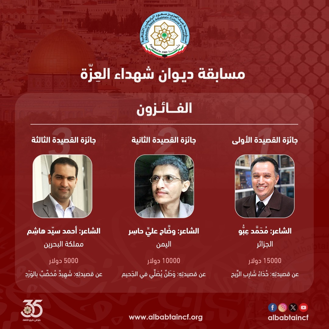 أعلن سعــــود عبدالعزيز البابطين رئيس مجلس أمناء مؤسسة عبدالعزيز البابطين الثقافية عن أسماء الفائزين بمسابقة “ديوان شهداء العزة " وذلك من خلال مؤتمر صحفي عُقد السبت الموافق 9 مارس 2024م في مقر مكتبة البابطين المركزية للشعر العربي.