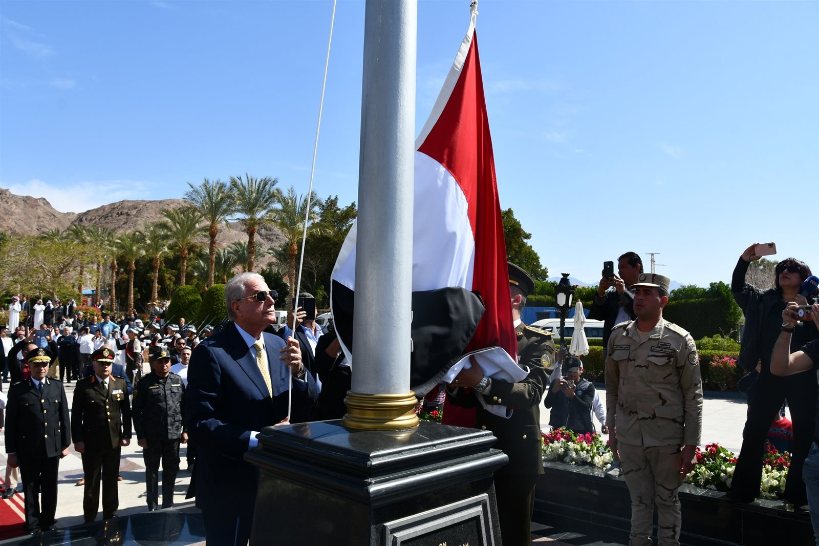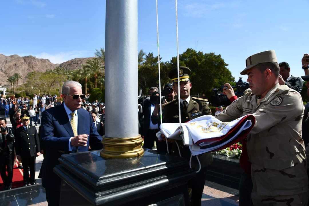 صور.. محافظ جنوب سيناء يرفع العلم المصري على طابا في الذكرى الـ 35