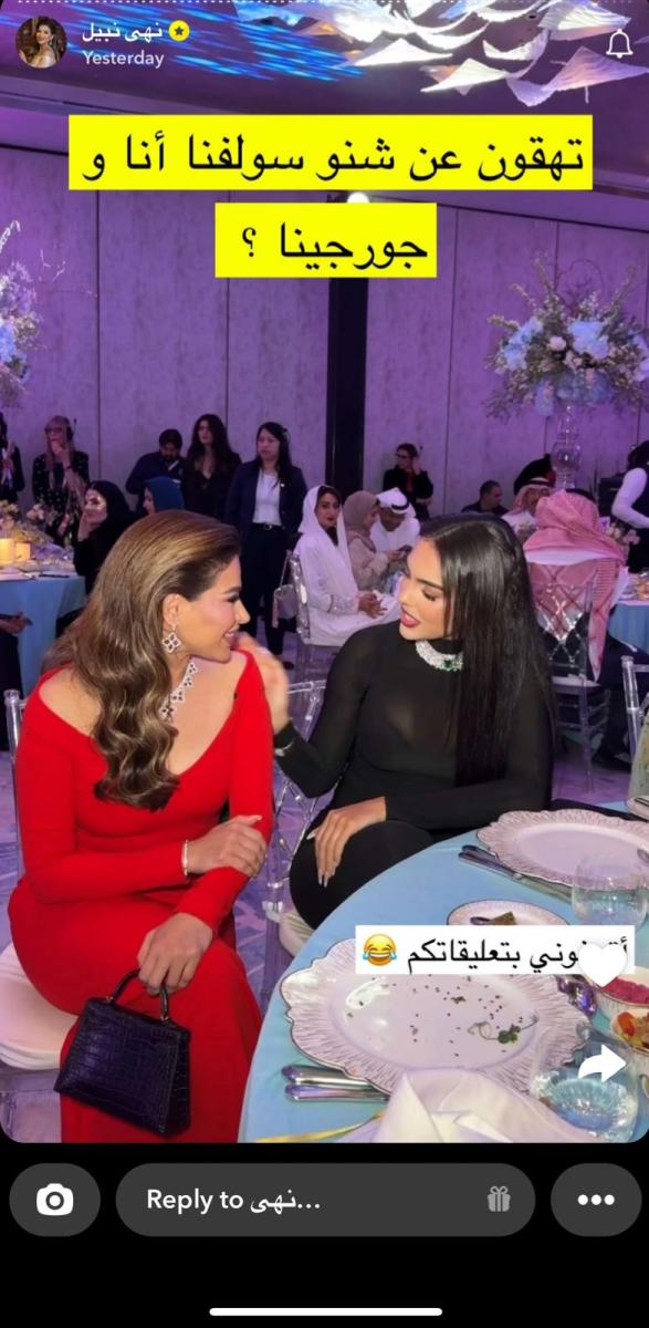 شاركت الإعلامية “نهى نبيل”صور لها عبر حسابها بتطبيق “سناب شات”، برفقة جورجينا. وعلقت عليها قائلة: "تهقون عن شو سولفنا أنا و جورجينا".
