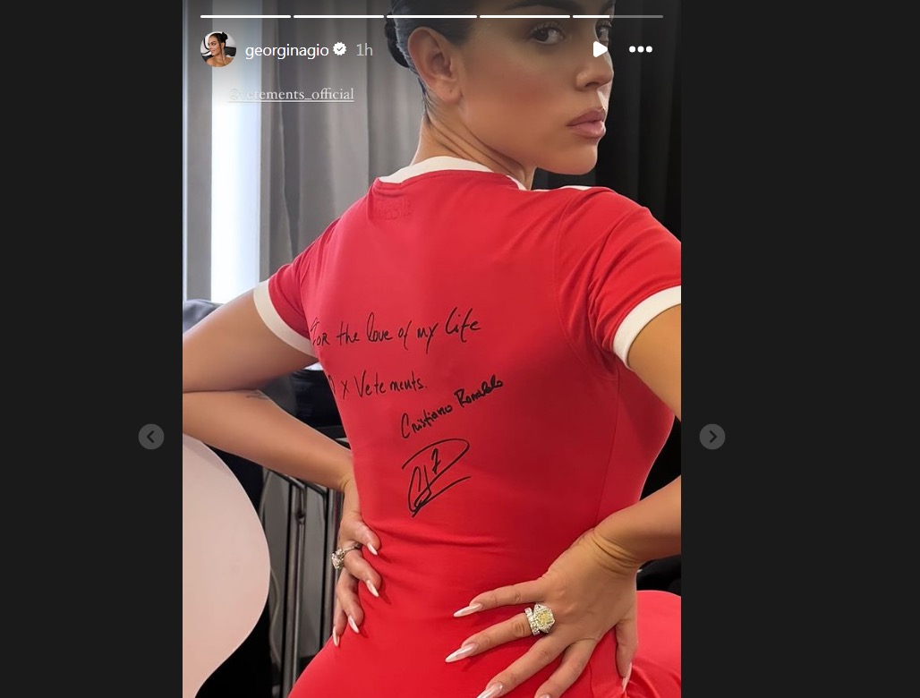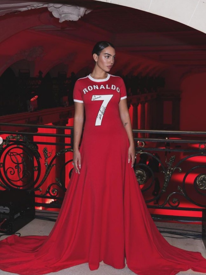 وظهرت “جورجينا” مؤخًرا في أسبوع الموضة بالعاصمة الفرنسية باريس، وهي ترتدي فستانًا باللون الأحمر يحمل إسم ورقم "7" أي رقم قميص رونالدو.