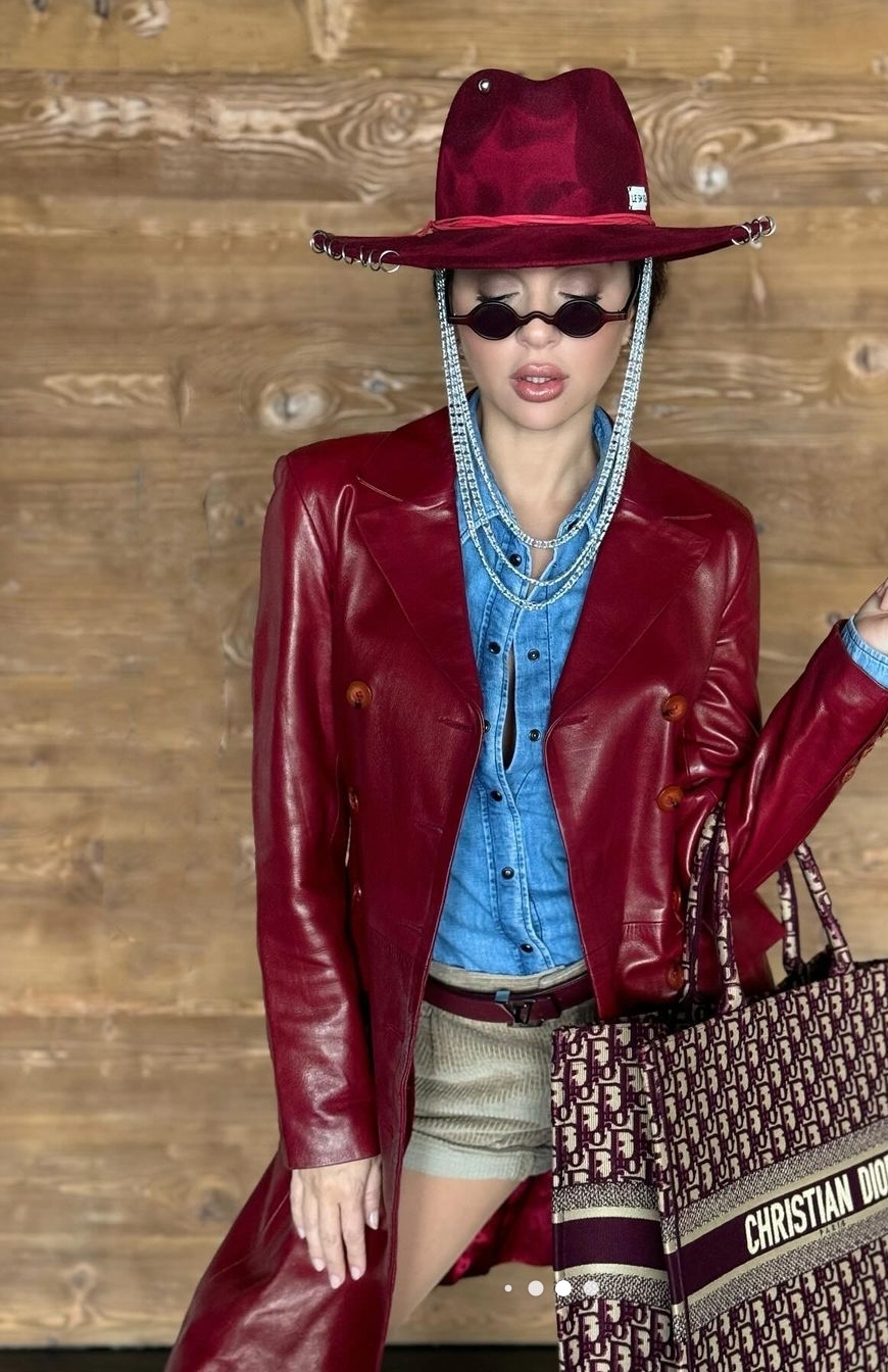 اما من الناحية الجمالية، اعتمدت لم خصلات شعرها للوراء وزينته بقبعه الكاوبوي بنفس اللون المزينه بالسلاسل المنسدلة ووضعت مكياجًا جذابًا مرتكزًا على الألوان الترابية مع تحديد عينيها بالكحل والماسكرا السوداء ولون النود في الشفاه.