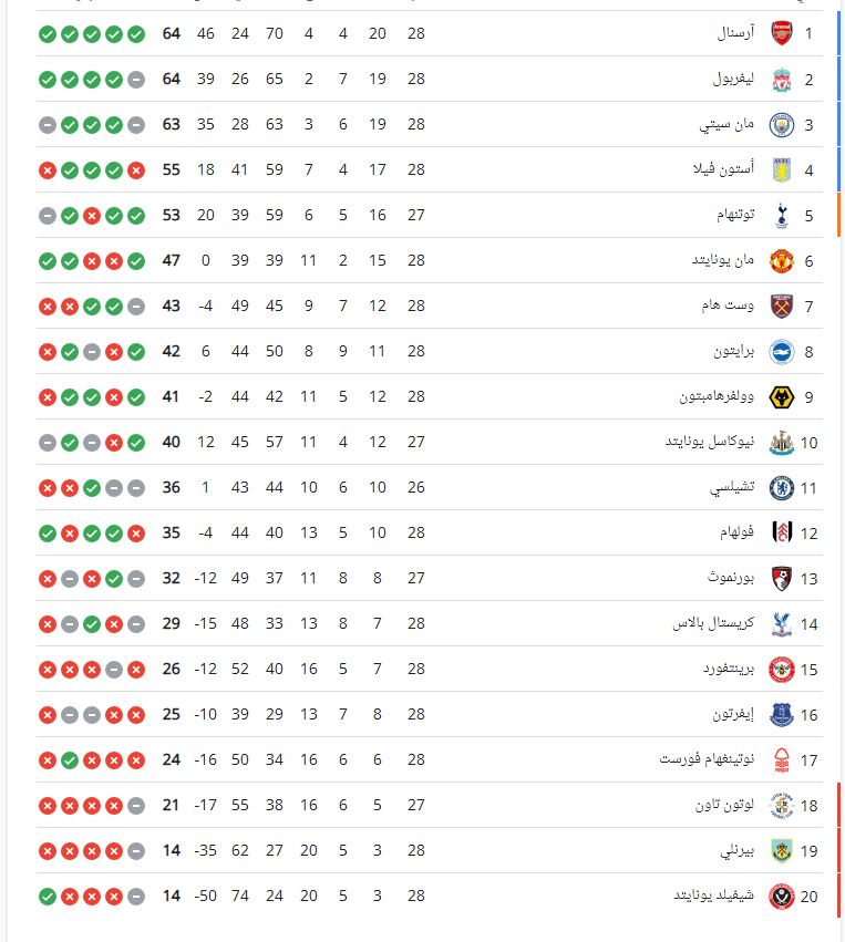 جدول ترتيب الدوري الإنجليزي.. آرسنال في الصدارة