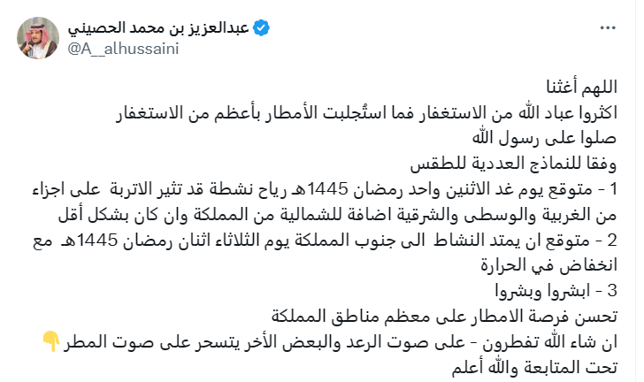 ولكنه وجه رسالة للمواطنين وزوار المملكة حول الطقس قائلًا:" أبشروا وبشروا.. تحسن فرصة الأمطار على معظم مناطق السعودية إن شاء الله. تُفطرون على صوت الرعد، والبعض الآخر يتسحر على صوت المطر".