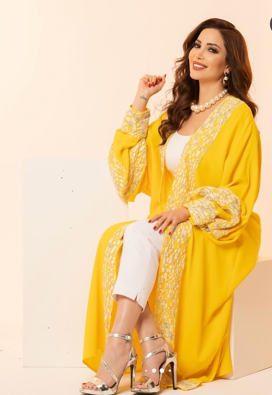 وبدت نسرين طافش بإطلالة ساحرة، مزجت بين الاناقة والاحتشام في آن واحد، حيث ارتدت بادي ابيض وتحته بنطال جينز وتألقت بكرديجان مبهج صمم من قماش ناعم باللون الأصفر الزاهي وتزينت بحبات اللؤلؤ الكبير.
