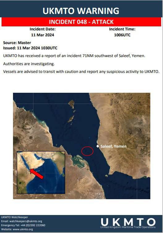 قالت هيئة عمليات التجارة البحرية البريطانية، إن وصلها بلاغ عن واقعة على بعد 71 ميلا بحريا جنوب غربي الصليف باليمن .