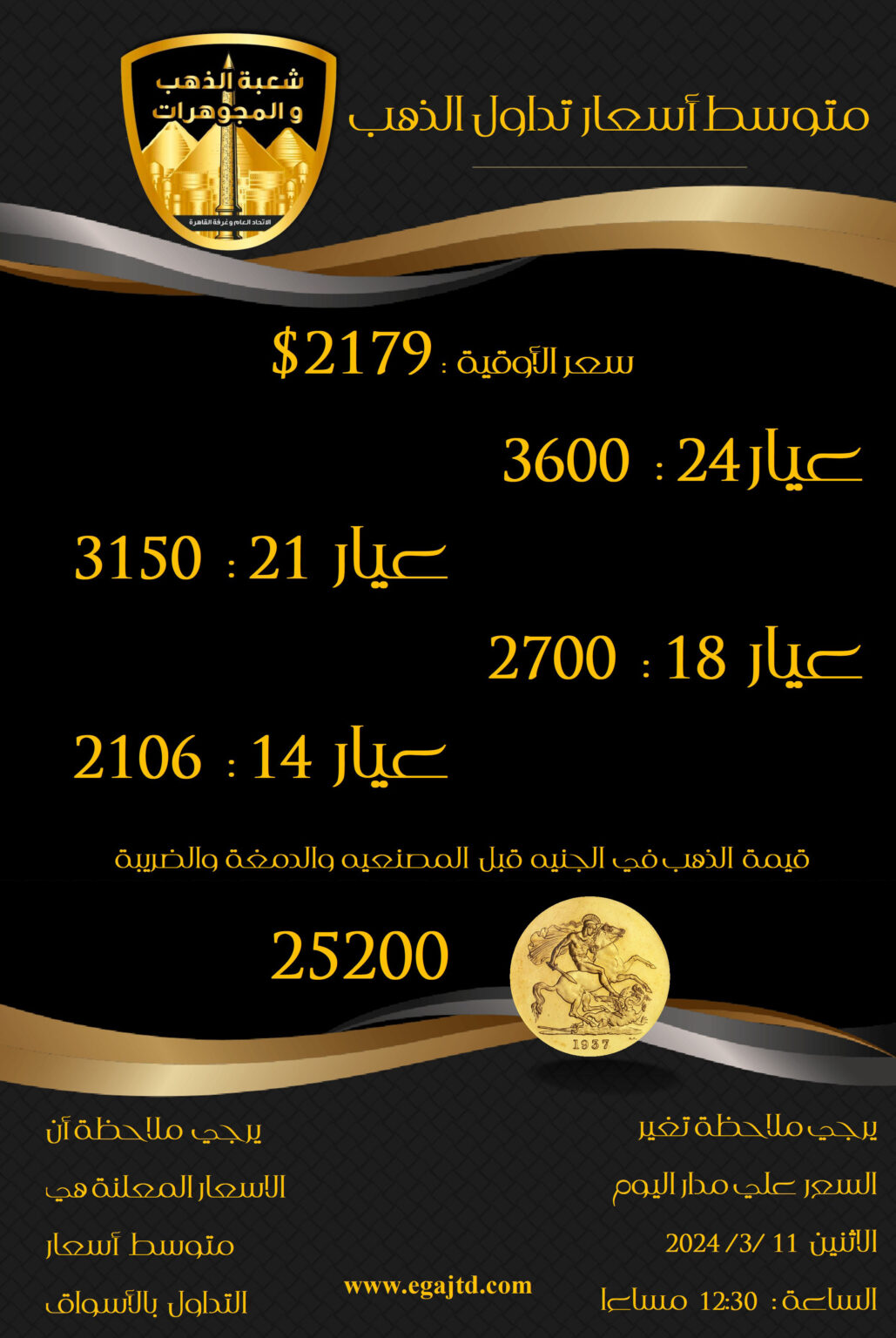 فيما نشرت الشعبة العامة للذهب والمجوهرات بالاتحاد العام للغرف التجاري عبر حسابها الرسمي بموقع التواصل الاجتماعي “فيسبوك”، متوسط أسعار الذهب بنهاية التعاملات المسائية أمس الاثنين والتي وصل فيها سعر جرام الذهب عيار 21 إلى 3150 جنيهًا دون المصنعية.