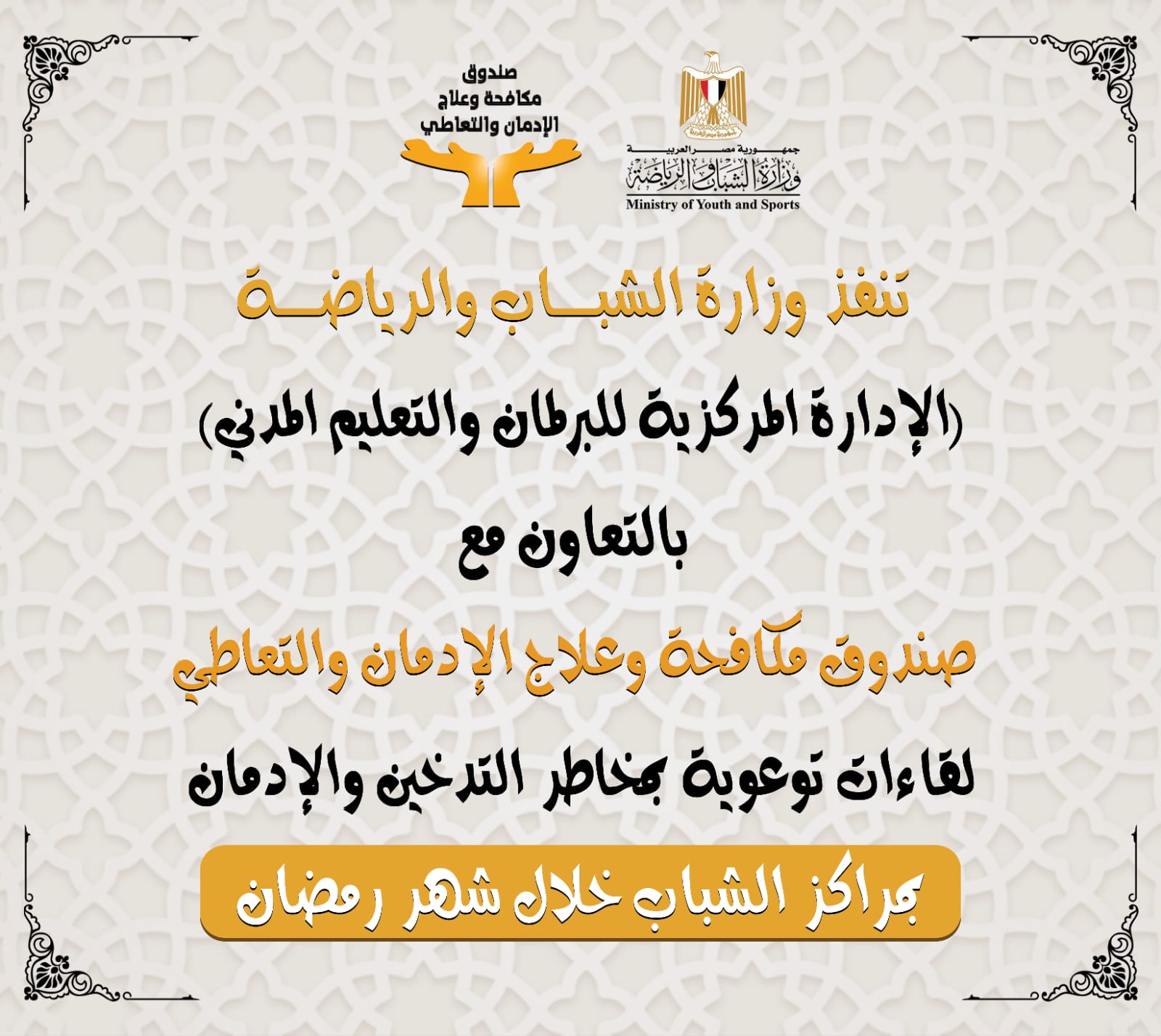 تستعد وزارة الشباب والرياضة ، من خلال الإدارة المركزية للتعليم المدني ( الإدارة العامة لبرلماني الطلائع والشباب ) ، وبالتعاون مع صندوق مكافحة وعلاج الإدمان والتعاطي ، نحو تنفيذ سلسلة من اللقاءات التوعوية بمخاطر التدخين والإدمان والتعاطي بــ 135 مركز شباب علي مستوي الجمهورية ، برعاية الدكتور أشرف صبحي ، وزير الشباب والرياضة .