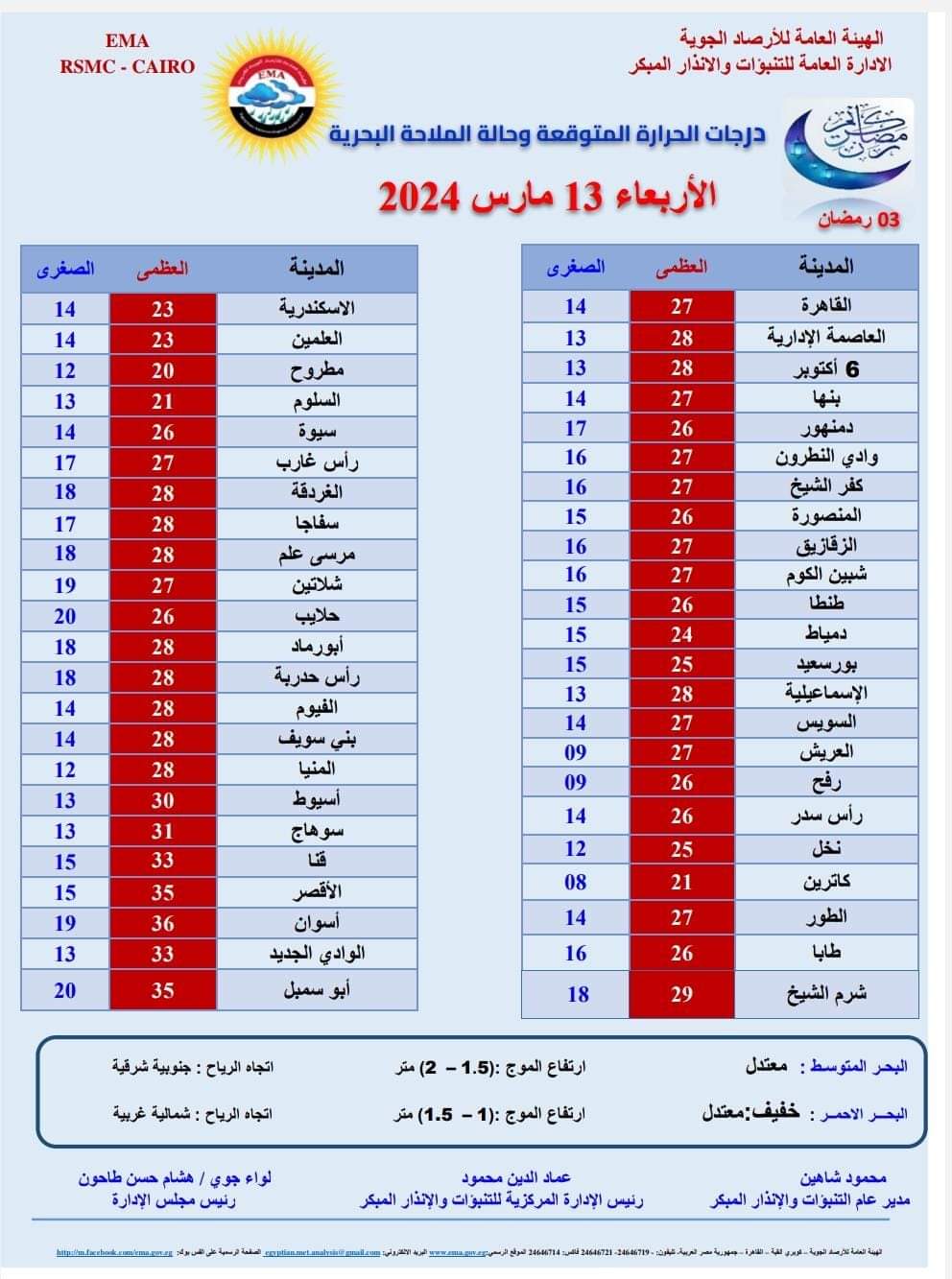 وتتوقع الأرصاد استمرار ارتفاع درجات الحرارة على كافة الانحاء، ويسود طقس حار نهارا على القاهرة الكبرى والوجه البحري والسواحل الشمالية الشرقية وجنوب سيناء وجنوب البلاد، مائل للحرارة على السواحل الشمالية الغربية، بارد ليلا وفي الصباح الباكر على مختلف الانحاء.