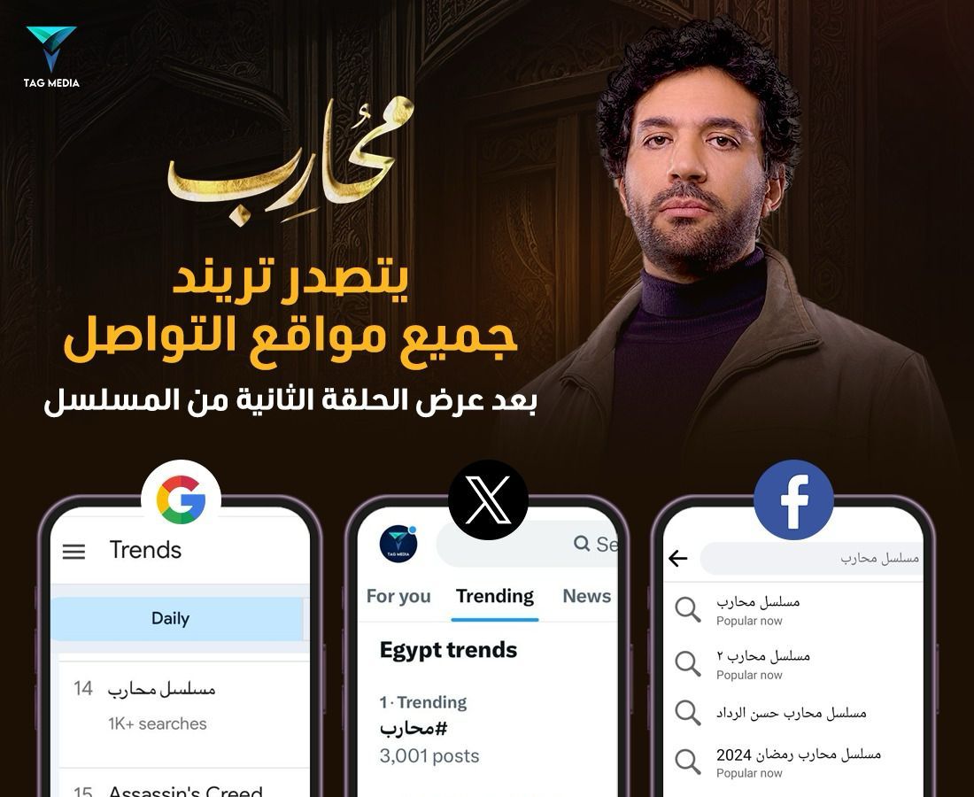 تصدر مسلسل محارب للنجم حسن الرداد، تريندات السوشيال ميديا، وذلك عقب انتهاء الحلقة التانية، والتي شهدت تصاعد في الاحداث وبدايه الصراع بين محارب وعزازي الذي يجسده ماجد المصري ومحاميه حسام الجيوشي.
