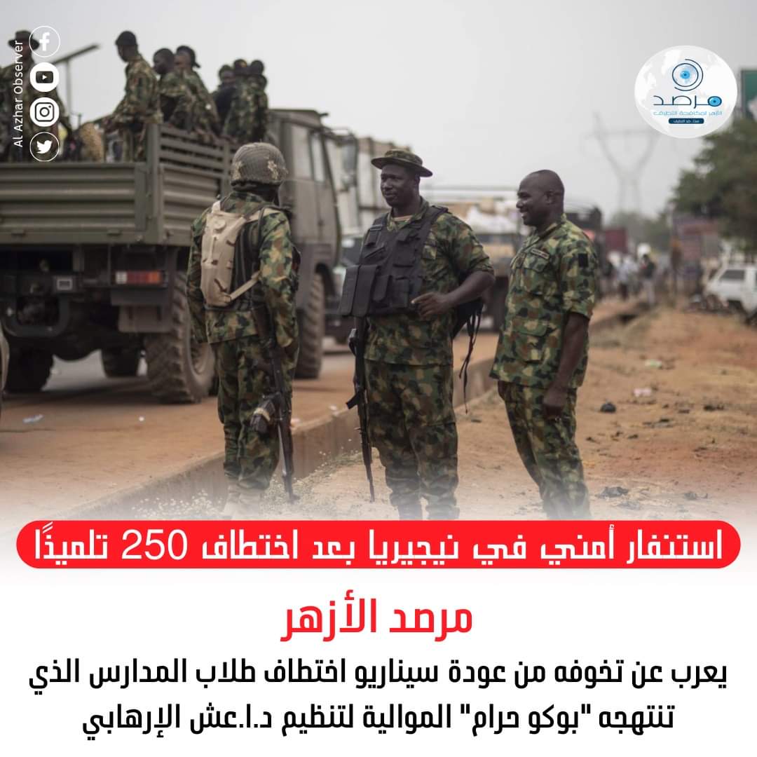 وأكملت: متابعة للأوضاع الأمنية في نيجيريا، يعرب مرصد الأزهر لمكافحة التطرّف عن تخوّفه من أن تكون هذه الحادثة بداية لعودة سيناريو اختطاف طلاب المدارس الذي تنتهجه جماعة بوكو حرام الموالية لتنظيم داعش الإرهابي.