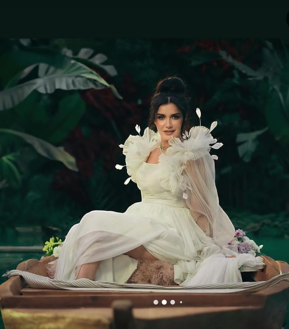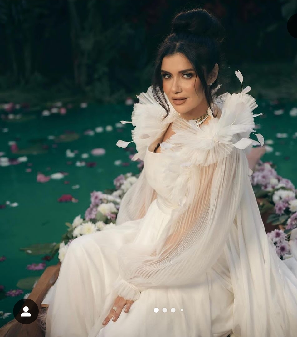 وبدت غادة عادل بإطلالة ساحرة، حيث ارتدت فستانا طويلا فضفاضا، بأكمام طويلة شفافة، صمم الفستان من قماش ناعم باللون الأبيض مما عكس قوامها الممشوق ووزنها المثالي لتشبه أميرات عالم ديزني.