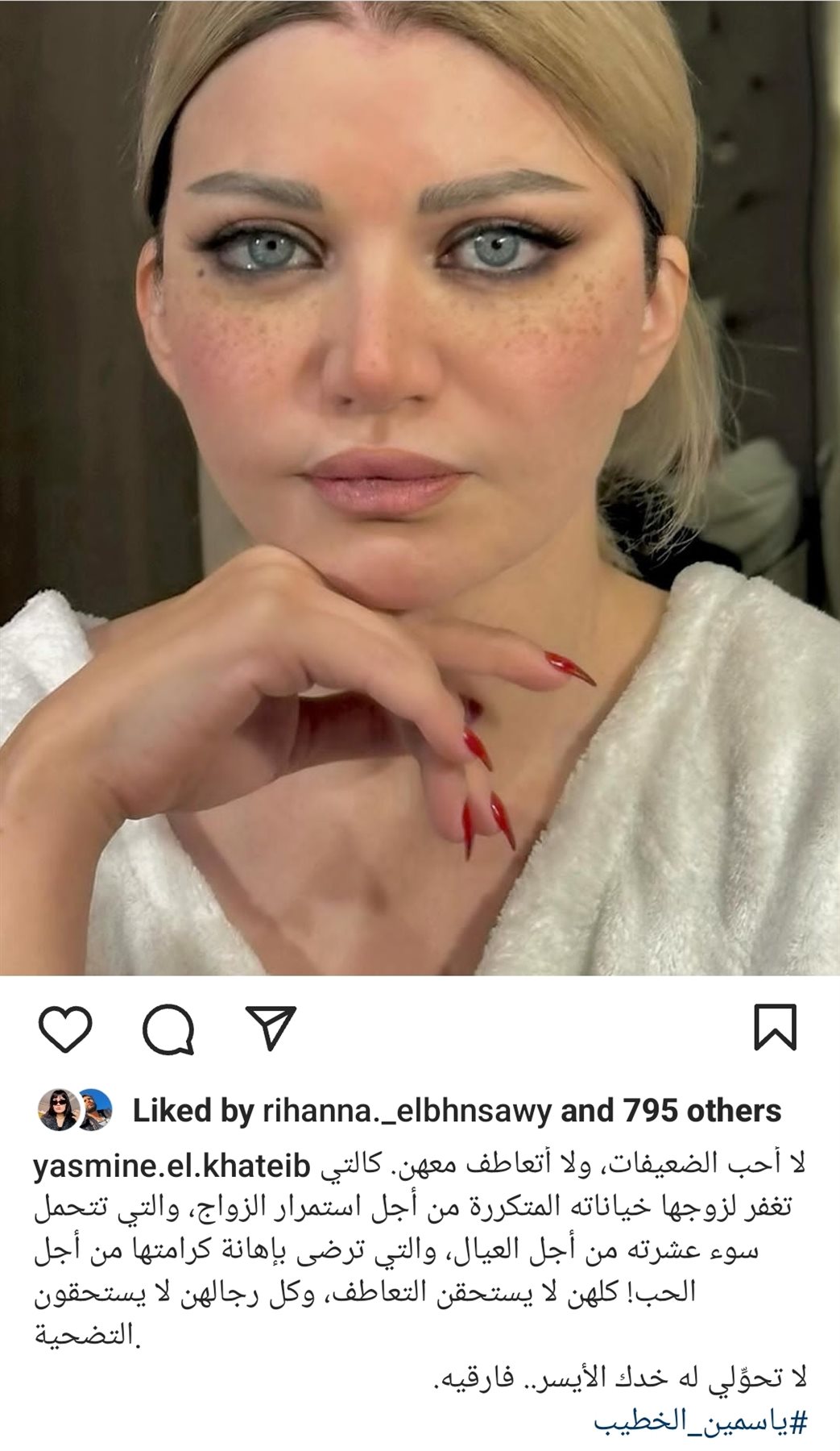وعلقت على الصورة، قائلة: "لا أحب الضعيفات ولا أتعاطف معهن، كالتي تغفر لزوجها خياناته المتكررة من أجل استمرار الزواج  والتي تحمل سوء عشرته  من أجل العيال،  والتي ترضى بإهانة كرامتها من اجل الحب! كلهن لا يستحقن التعاطف وكل رجالهن لا يستحقون التضحية".