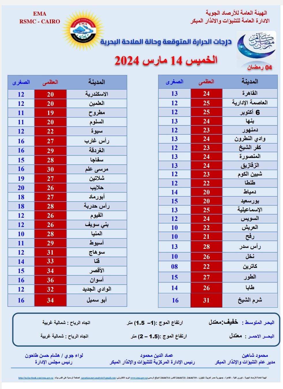 وفيما يلي نستعرض درجات الحرارة الصغرى والعظمى بعدد من المدن والمحافظات المصرية..