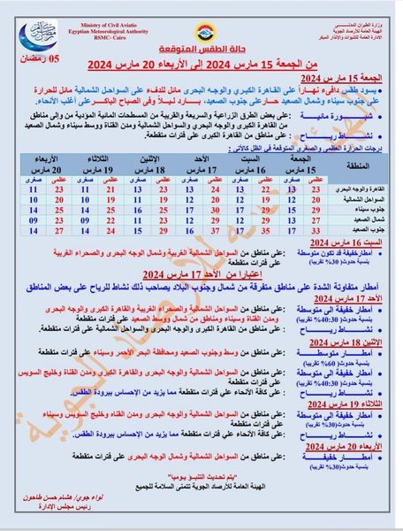 بينما يسود طقس دافئ على شمال البلاد، حيث من المتوقع أن تسجل القاهرة 23 درجة، وتميل درجات الحرارة نحو الانخفاض خلال الفترة المقبلة، كما توجد فرصة لسقوط الأمطار على القاهرة يوم الأحد المقبل.