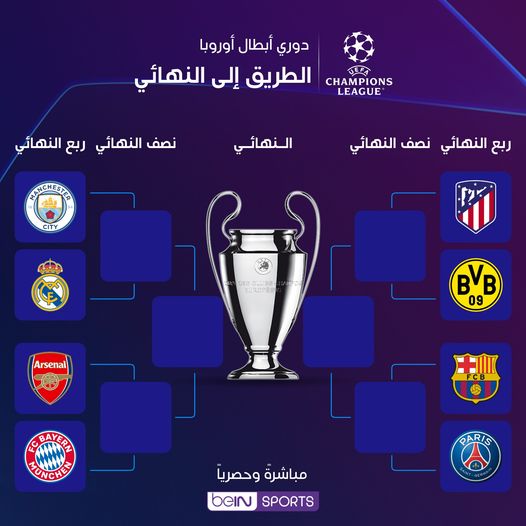 وأقيمت قرعة دوري أبطال أوروبا ظهر اليوم الجمعة في مقر الاتحاد الأوروبي لكرة القدم “يويفا” بمدينة نيون السويسرية وذلك بنظام مفتوح حيث يمكن أن يتقابل أي فريقين من دولة واحدة في ربع النهائي دون قيود على عكس بعض السنوات الماضية. وأجريت القرعة بمشاركة الـ 8 فرق المتاهلبة لدور الثمانية وهم: مانشستر سيتي وآرسنال ( إنجلترا) ريال مدريد وأتلتيكو مدريد وبرشلونة ( إسبانيا) بايرن ميونخ وبوروسيا دورتموند ( المانيا )، باريس سان جيرمان (فرنسا)، كما يشهد الحفل ذاته إجراء قرعة الدور نصف النهائي للبطولة.