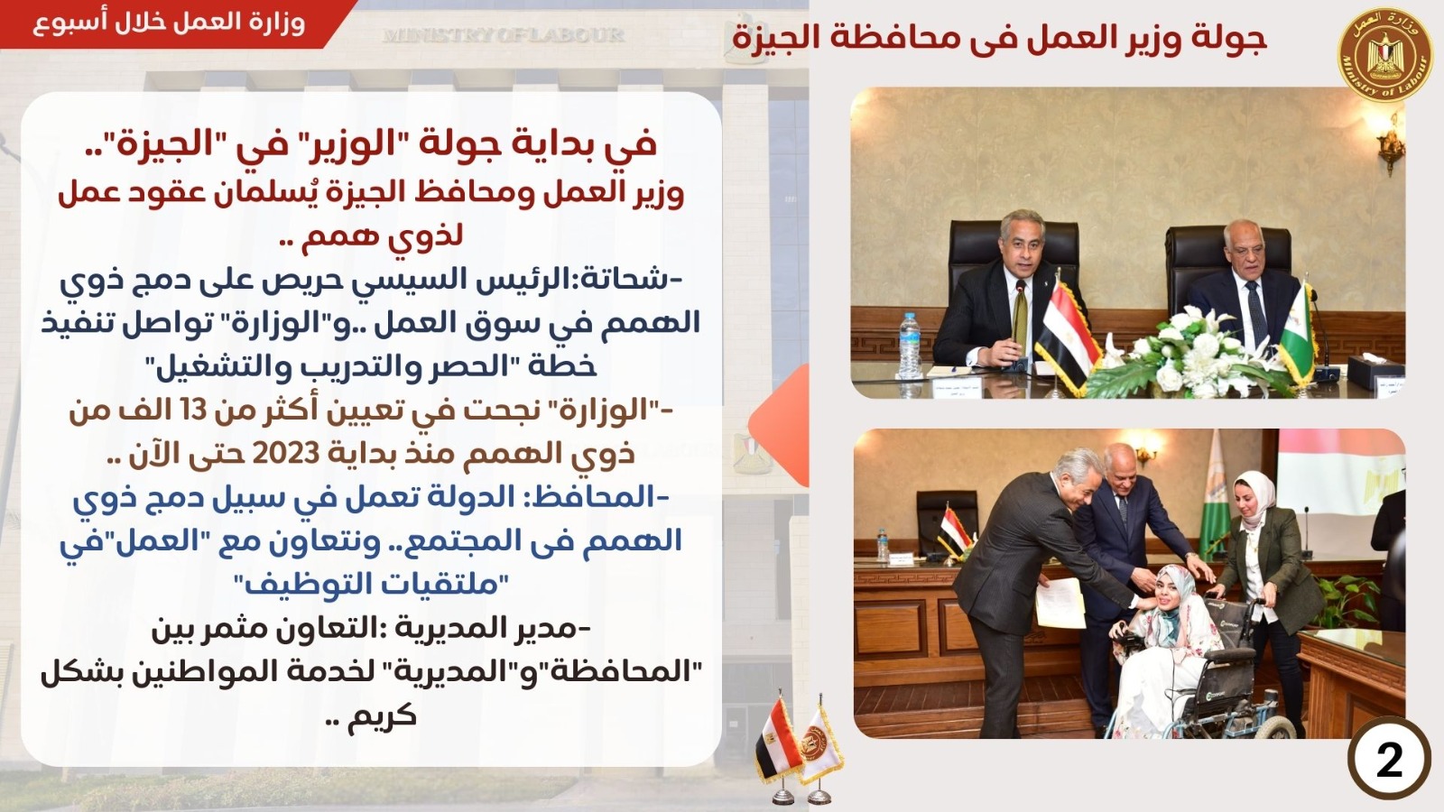 قام وزير الهمل حسن شحاتة، مع بداية الأسبوع، بجولة لمحافظة الجيزة، بدأها بزيارة اللواء أحمد راشد في ديوان عام المحافظة، ليبحثا مجموعة من الملفات ذات الاهتمام المشترك، منها دمج ذوي الهمم في سوق العمل، والتدريب المهني، وتنظيم ملتقيات التوظيف لتوفير فرص عمل للشباب في القطاع الخاص.