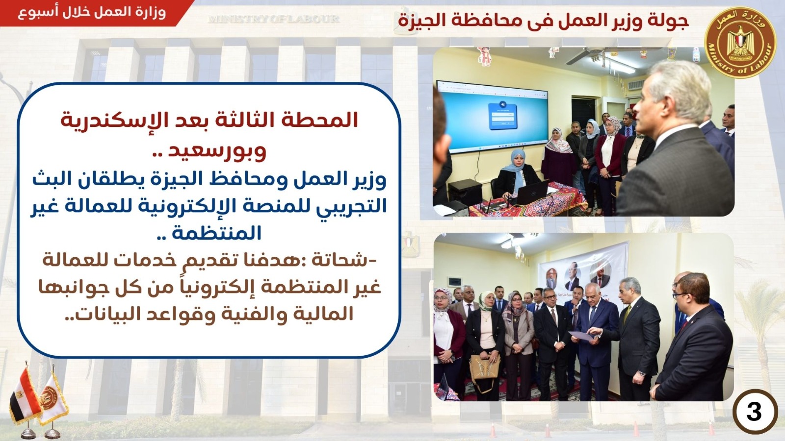 أطلق حسن شحاتة وزير العمل، ومحافظ الجيزة ، البث الأولي والتجريبي "للمنصة الإلكترونية" للعمالة غير المنتظمة، وذلك بمقر مديرية عمل الجيزة، وذلك في إطار جولة نفذها الوزير في مواقع عمل وإنتاج بمحافظة الجيزة.